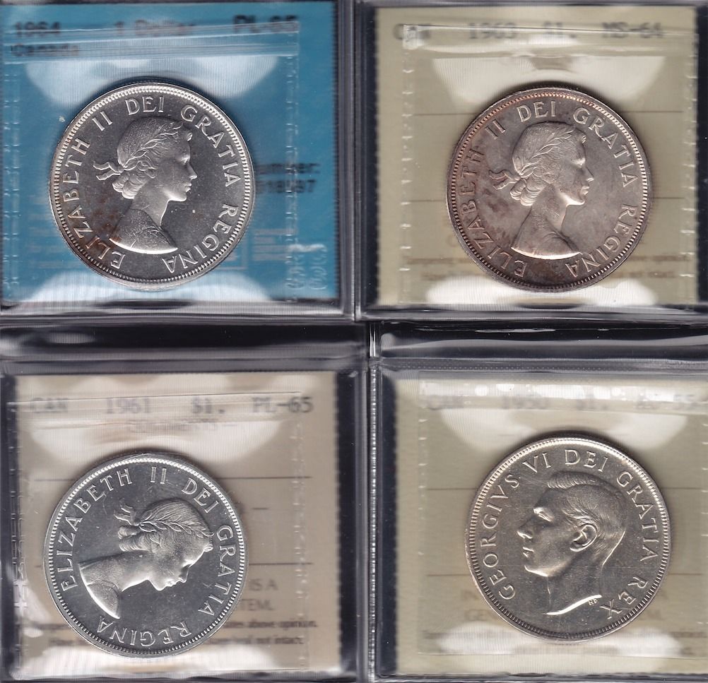 Lot of Four Silver Dollars - Dates include: 1950 Arnprior ICCS AU-55; 1961 ICCS PL-65; 1963 ICCS MS-64; 1964 CCCS PL-65. 4 Pcs.