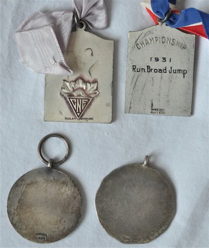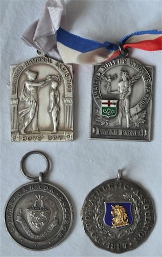 Amateur Athletic Union of Canada, Ontario Branch, 1931 Broad Jump; Canadian National Exhibition, circa 1920, unnamed; Boston Athletic Association, 1887, unnamed, loop at top; Lower Canada College, unnamed, school crest. All silver, 61 gms. 4 Pcs.