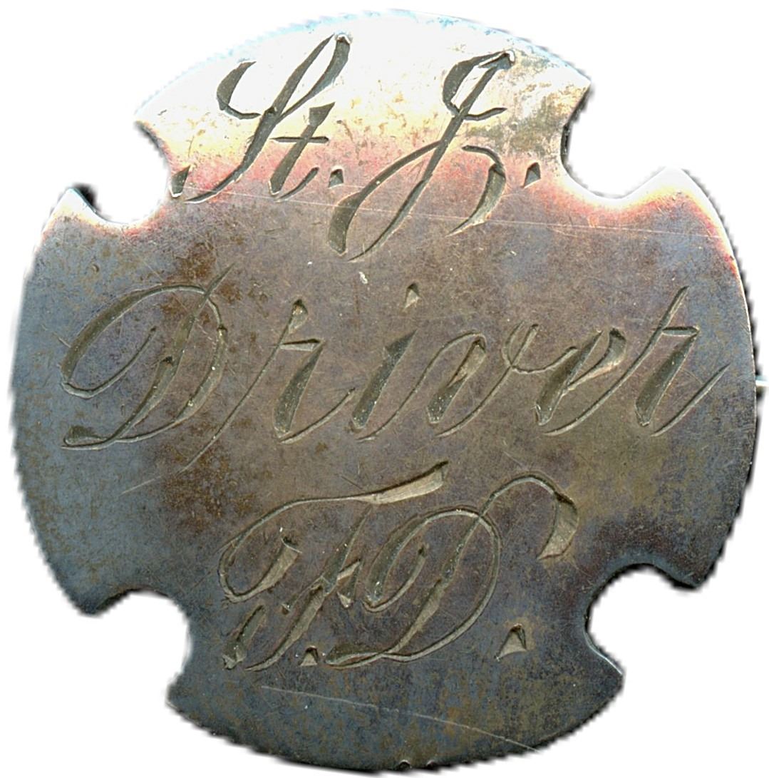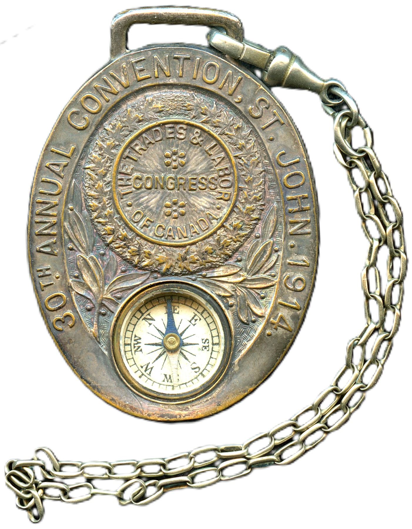St. John N.B. with the Revering Falls Bridge, Silver, Holed for suspension, 29mm, 7.9g, EF; Saint John Railway Company Brass Button, Made by Thomas Carlyle Birmingham England, 21.5mm, 4.1g, VF; 30th Annual Convention St John 1914 The Trade & Labor Congress Of Canada. Silver Plated Copper Fob with a Compass, 33 x 46.5mm, 17.2g, Produced by the Whitehead & Hoag Co., Newark, N.J., EF; St. John Driver Fire Department Silver Pin, 22.5mm, 2.4g, EF. 4pcs. From the Geoffrey Bell Collection.