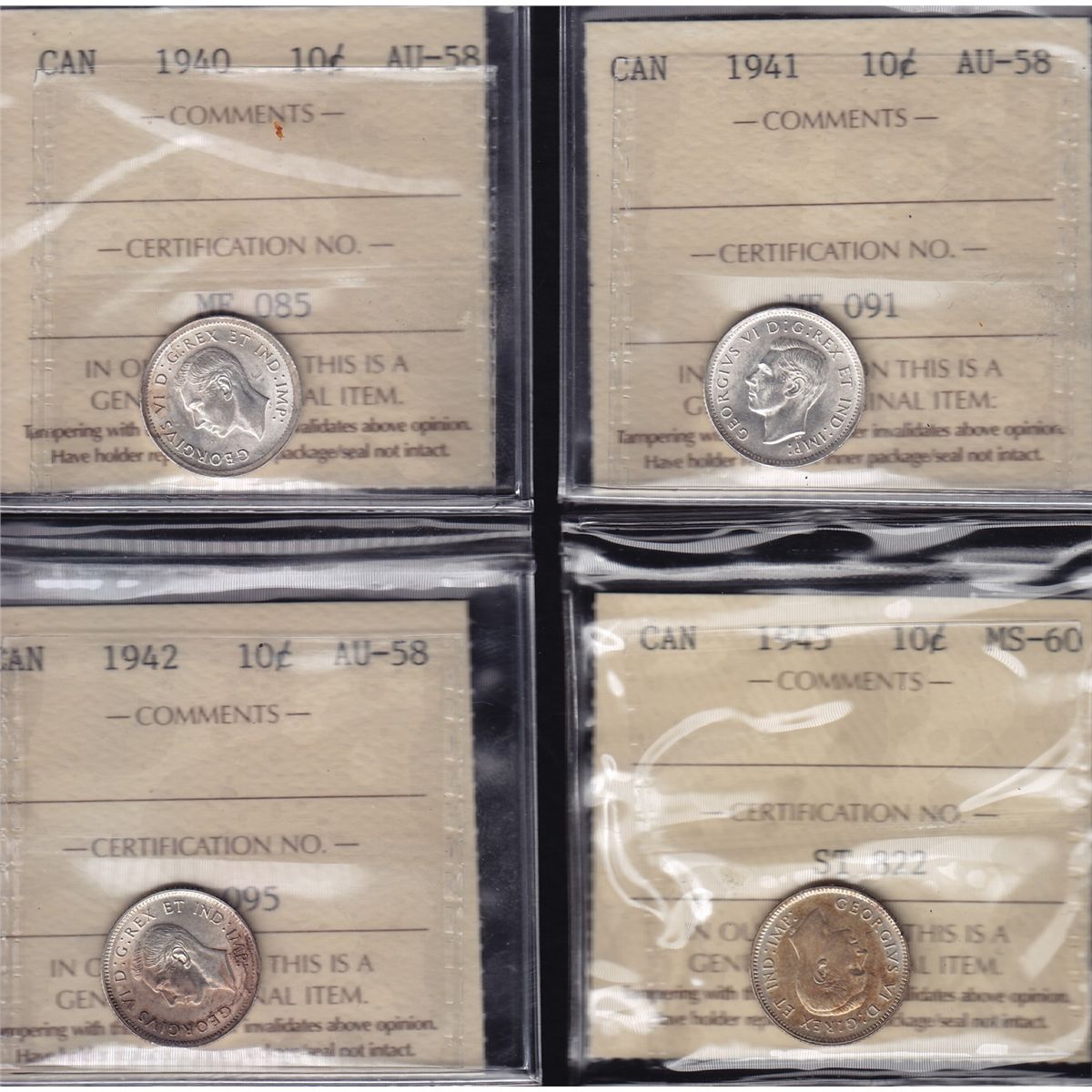 Lot of Four Ten Cents - 1940 ICCS AU-58; 1941 ICCS AU-58; 1942 ICCS AU-58; 1945 ICCS MS-60. 4 Pcs.