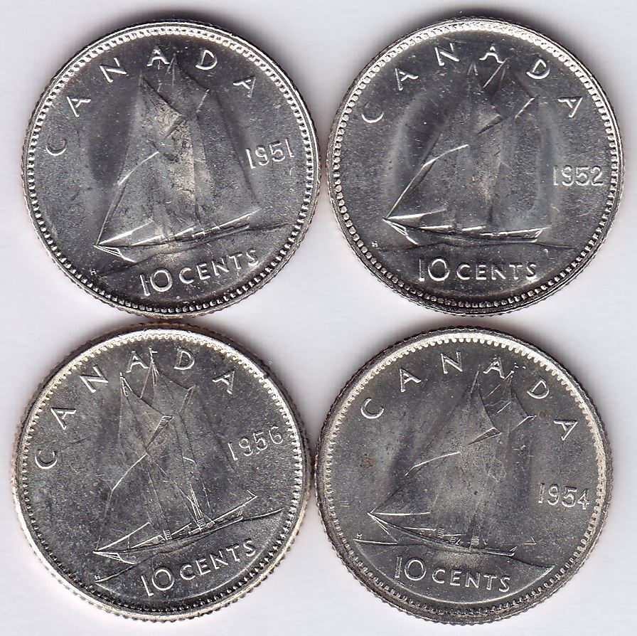 Lot of Four Uncirculated Ten Cents Dates include: 1951, 1952, 1954, 1956 with Dot. 4 Pcs.