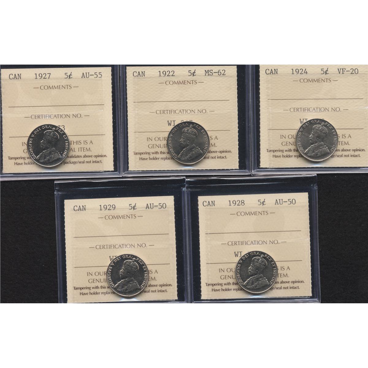 ICCS graded: 1922 MS-62, 1924 VF-20, 1927 AU-55, 1928 AU-50, 1929 AU-50, 1930 VF-30, 1931 EF-45, 1932 VF-30, 1933 VF-20