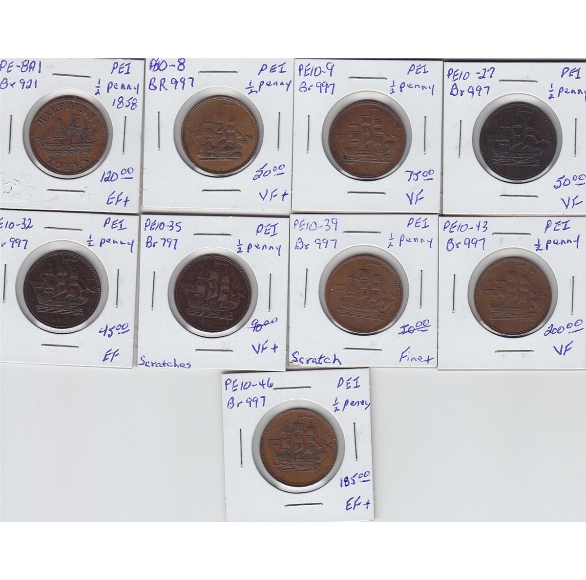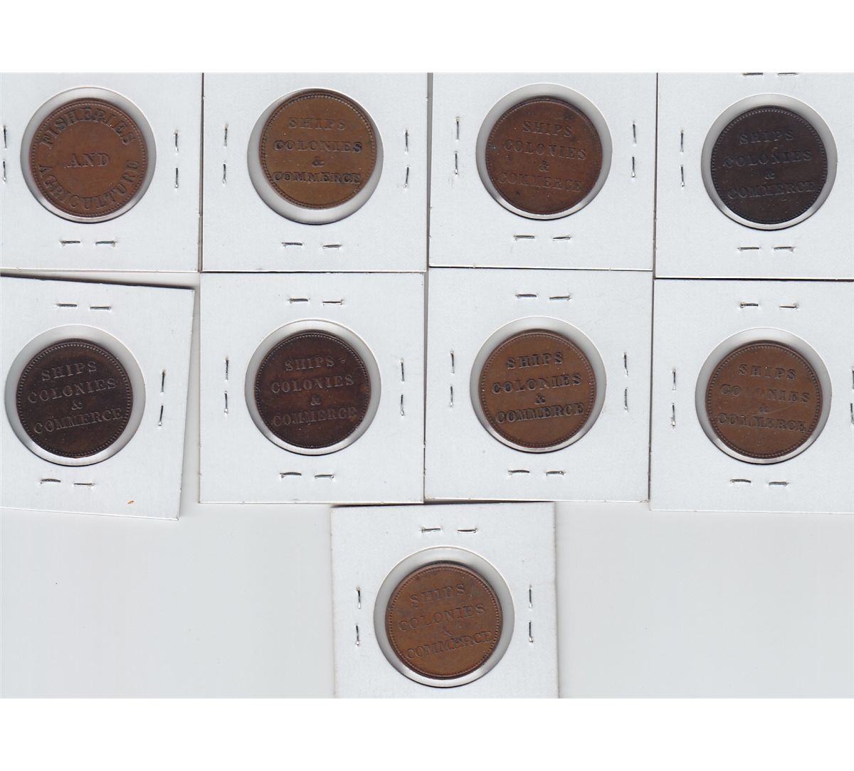 Lot includes: CH PE-8A1, Br 921. 1858 Half Penny Steamboat, EF+. CH PE10-8, Br 997. Ships Colonies and Commerce, VF+. CH PE10-9, Br 997. Ships Colonies and Commerce, VF. CH PE10-27, Br 997. Ships Colonies and Commerce, VF. CH PE10-32, Br 997. Ships Colonies and Commerce, EF. CH PE10-35, Br 997. Ships Colonies and Commerce, VF, scratches. CH PE10-39, Br 997. Ships Colonies and Commerce, F, Scratch. CH PE10-43, Br 997. Ships Colonies and Commerce, VF. CH PE10-46, Br 997. Ships Colonies and Commerce, EF+. Nice Quality Lot. 9 Pcs.