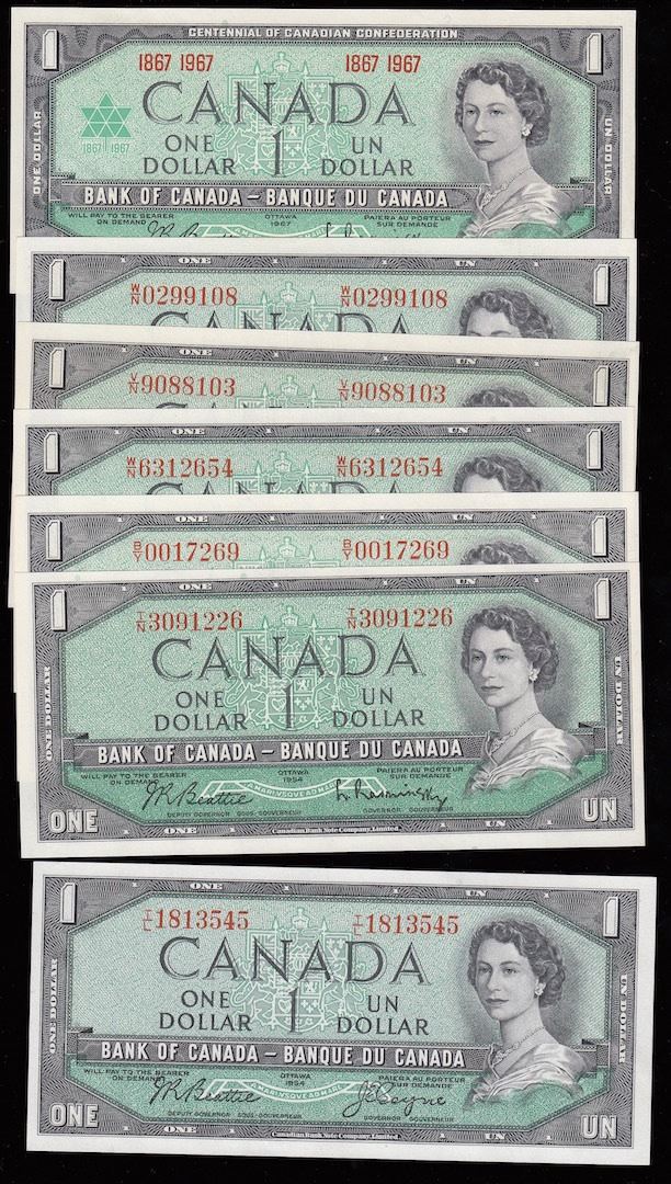 Lot of Seven Bank of Canada $1 Notes - Includes: 1967 no serial # and six 1954 notes. All uncirculated. 7 Pcs.