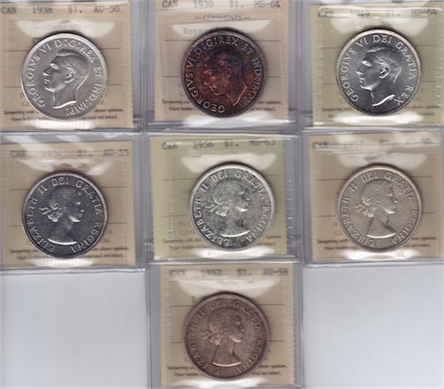Lot of Seven ICCS Graded One Dollars Lot includes: 1938 AU-50, cleaned. 1939 MS-64, Rotated Dies. 1949 MS-64. 1954 AU-55. 1956 MS-63. 1957 AU-50. 1957 1 Waterline AU-58. 6 Pcs.