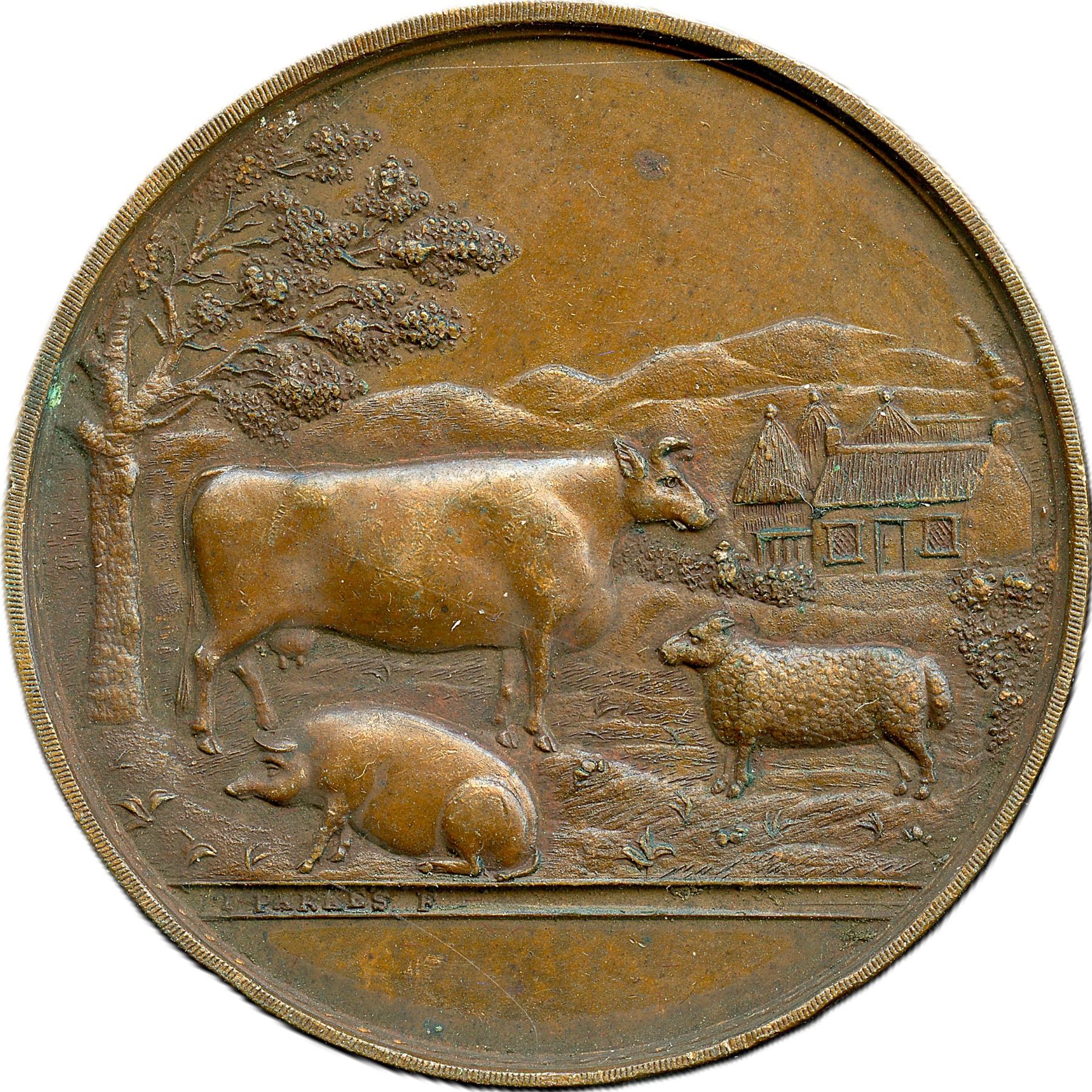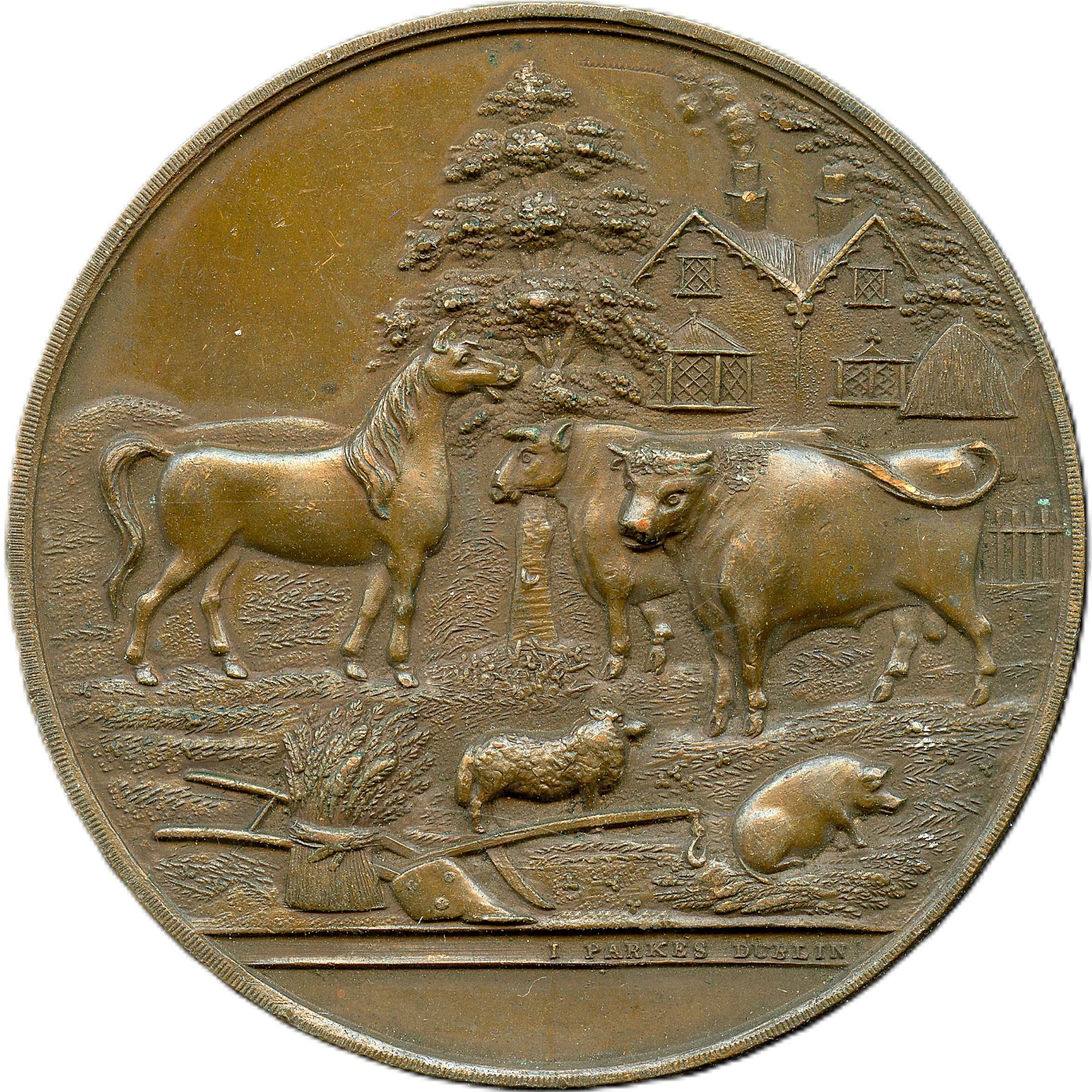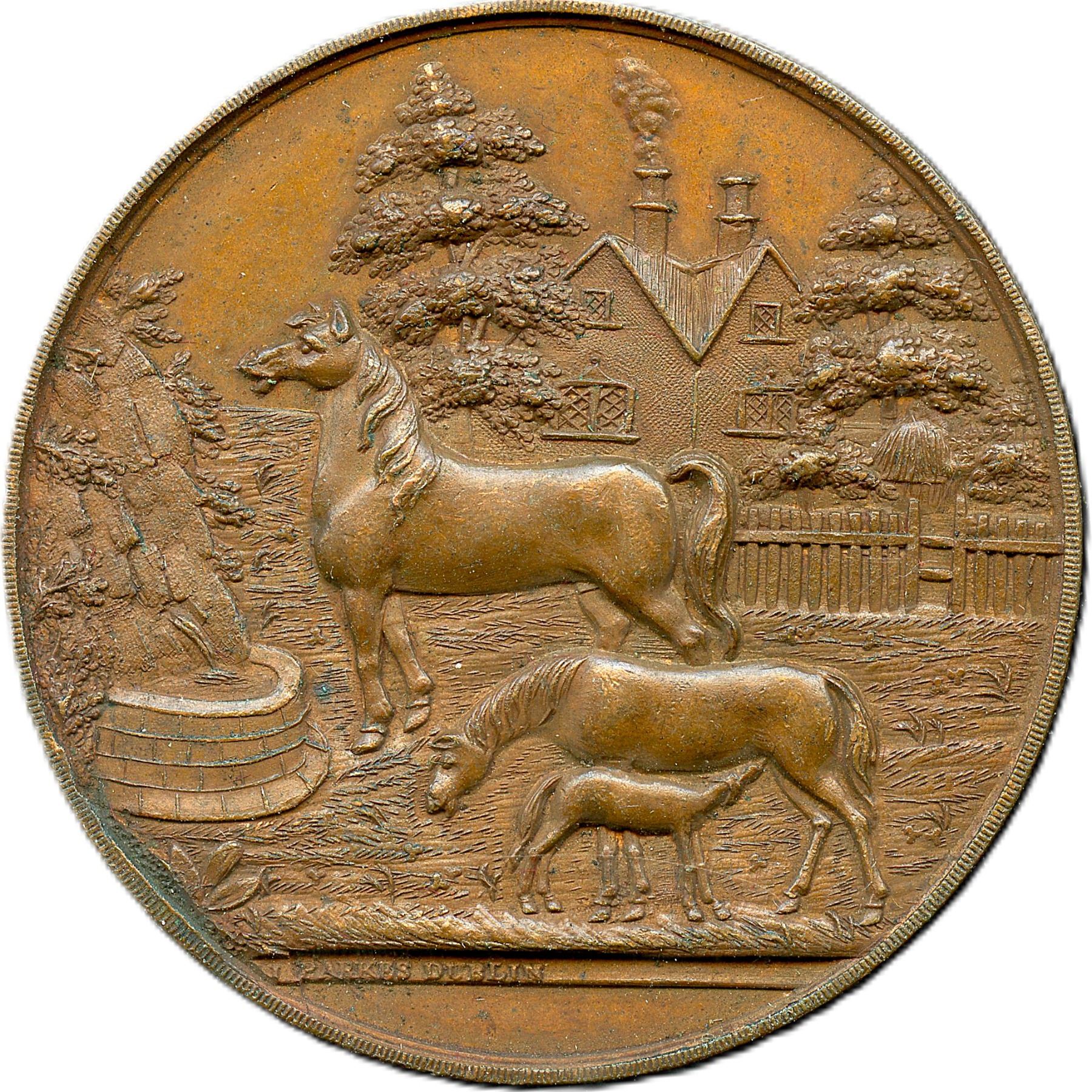 Lot of Six Bronze Agricultural British Historical Medals with livestock designs. All the medals are Signed Parkes Dublin. Enniscorthy Union Agricultural Society, 51.2mm, 47.7g. EF; Kells Union Farming Society, 46.6mm, 40.3g. EF: Imokilly & Barrymore Farming Society, 50.6mm, 51.2g. EF; Parsontown Union & KingsCo. Farming Society, 38.7mm, 27.0g. EF; Wicklow Farming Society, 42.4mm, 31.9g. EF; Wicklow Farming Society, 42.1mm, 27.8g. EF. 6pcs.