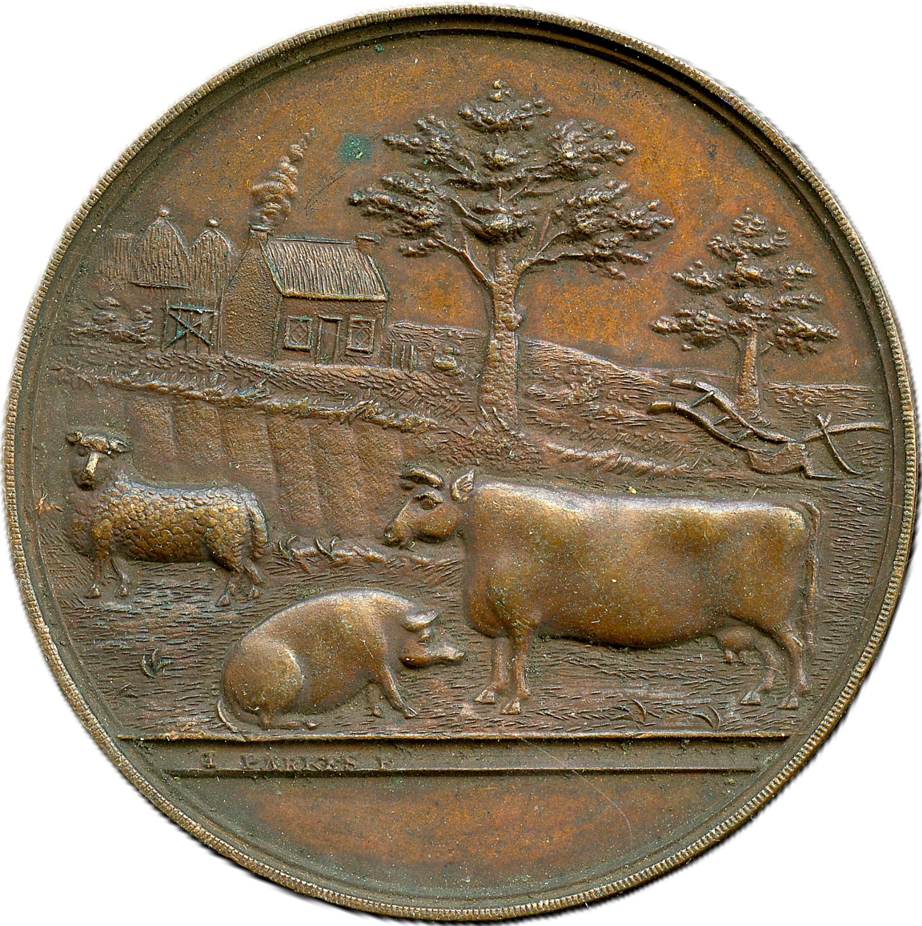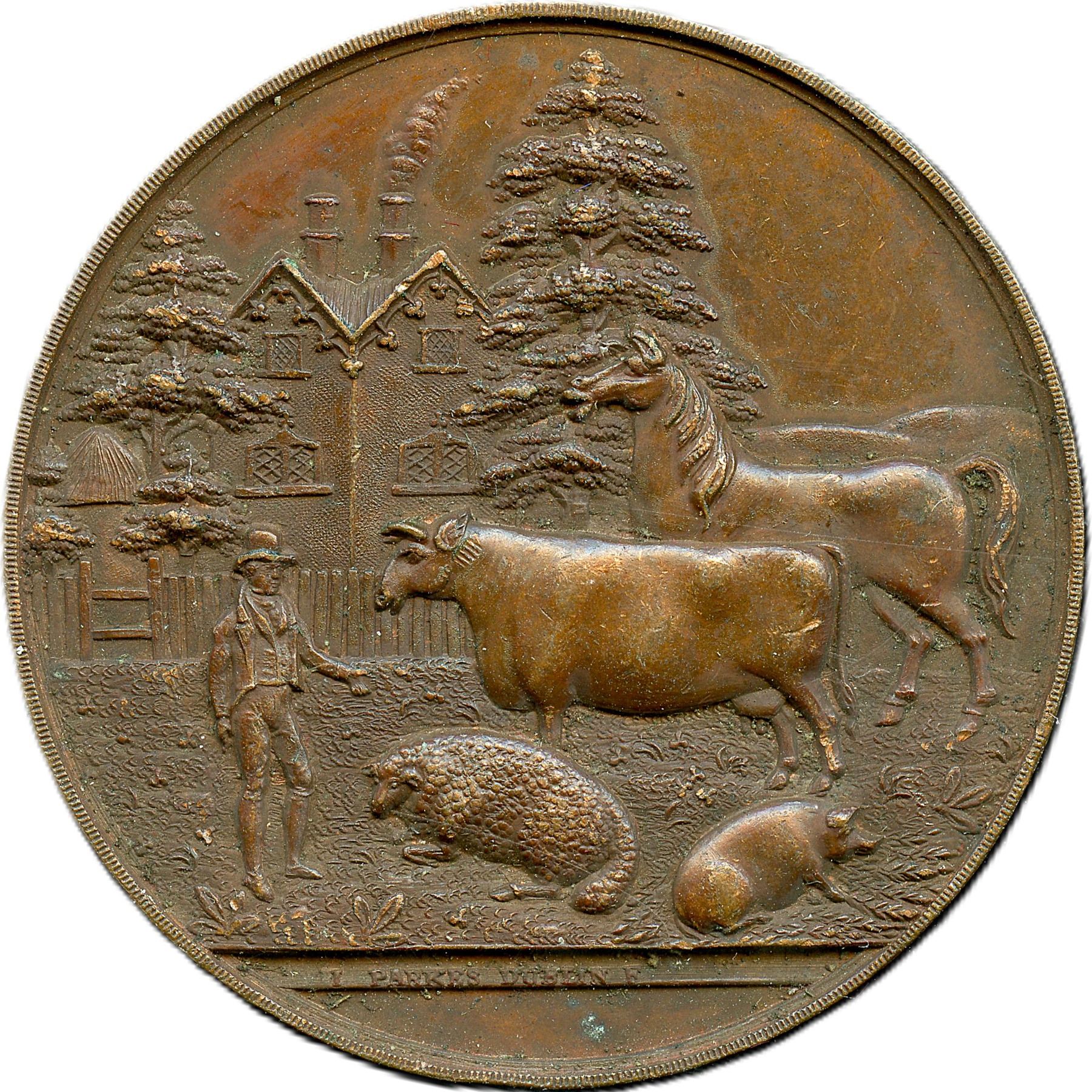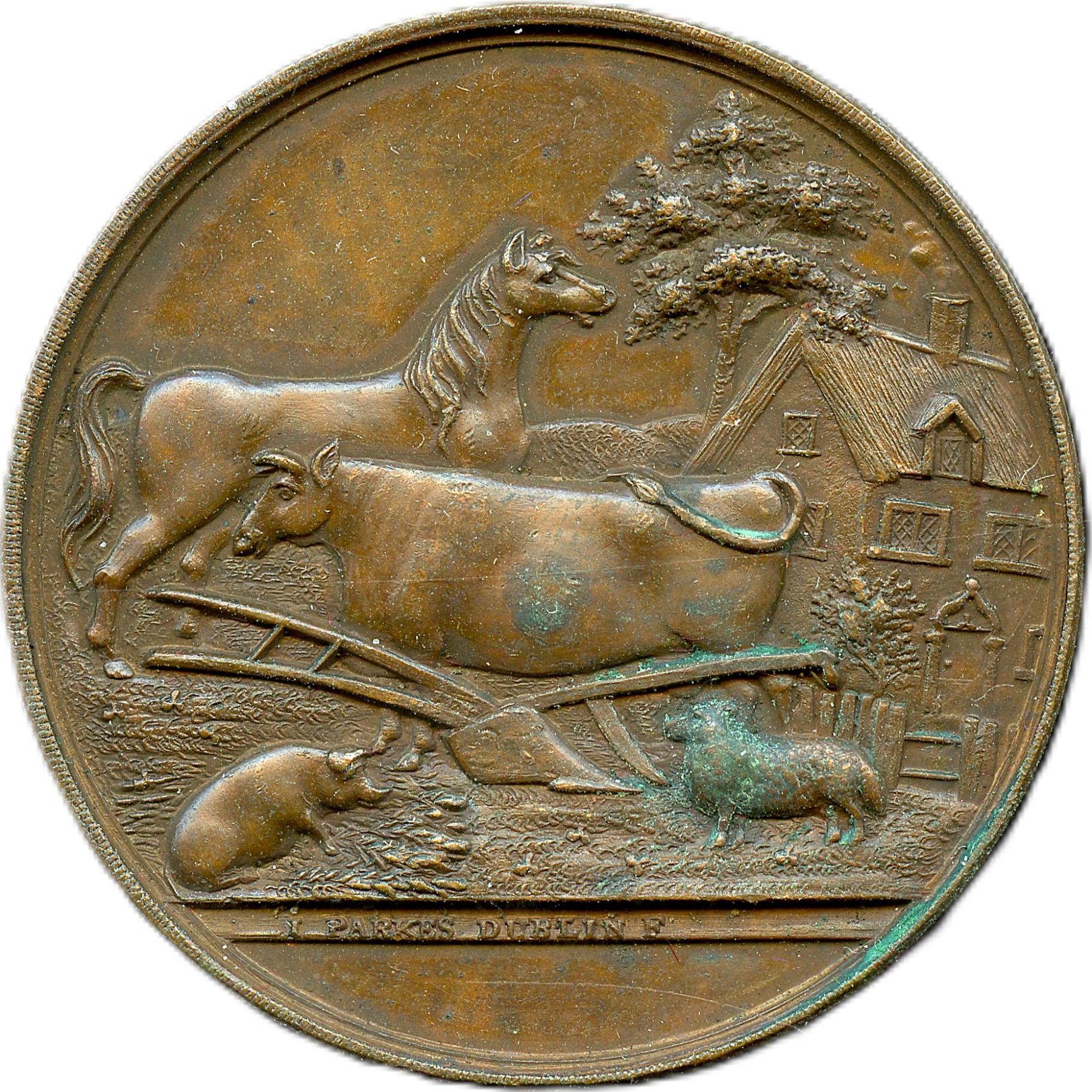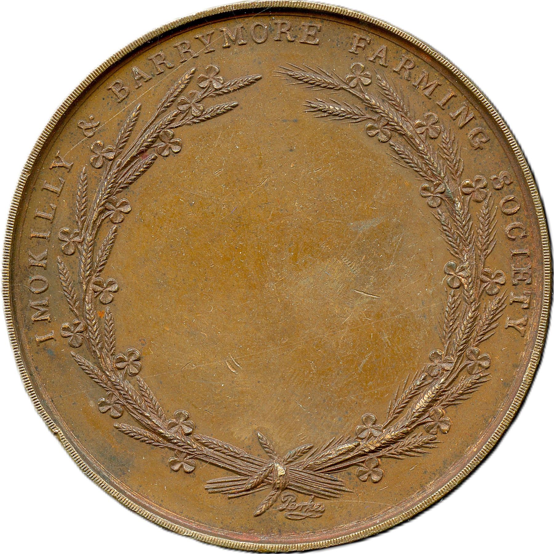 Lot of Six Bronze Agricultural British Historical Medals with livestock designs. All the medals are Signed Parkes Dublin. Enniscorthy Union Agricultural Society, 51.2mm, 47.7g. EF; Kells Union Farming Society, 46.6mm, 40.3g. EF: Imokilly & Barrymore Farming Society, 50.6mm, 51.2g. EF; Parsontown Union & KingsCo. Farming Society, 38.7mm, 27.0g. EF; Wicklow Farming Society, 42.4mm, 31.9g. EF; Wicklow Farming Society, 42.1mm, 27.8g. EF. 6pcs.