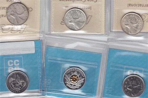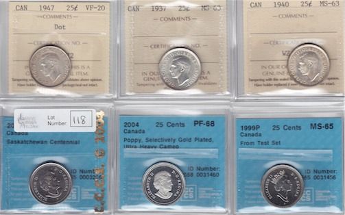 Includes: 1937 ICCS MS-63; 1940 ICCS MS-63; 1947 ICCS VF-20, DOT; 1999P CCCS MS-65; 2004 CCCS PF-68, Poppy, Selective Gold Plating, UHC; 2005 CCCS MS-65, Saskatchewan Centennial. 6 Pcs.
