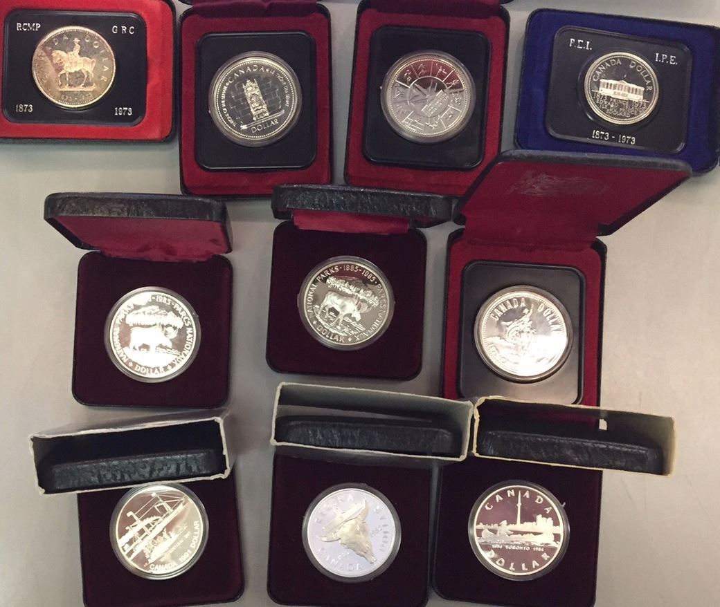 Lot of Ten Canadian RCM Dollars - Dates include: specimen & proofs: 1973, 1975, 1977, 1978, 1982, 1984, 2 x 1985, 1991. 1973 nickel dollar. 10 Pcs.