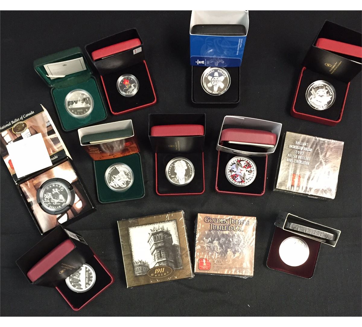Lot of Thirteen Silver Dollars Includes: 1994 Proof, 1911-2001 Limited Edition, 2001 Uncirculated, 2003 Uncirculated, 2003 Coronation, 2004 Uncirculated, 2004 Proof, 2004 Lucky Loonie, 2007 Proof, 2008 Limited Edition Poppy, 2010 Limited Edition Proof, 2010 Olympic Sun, 2012 Two Loons. 13 Pcs.