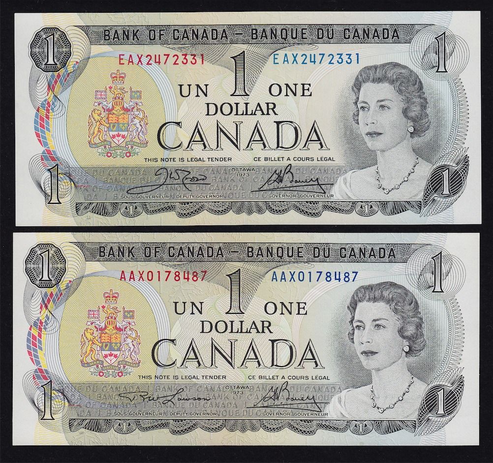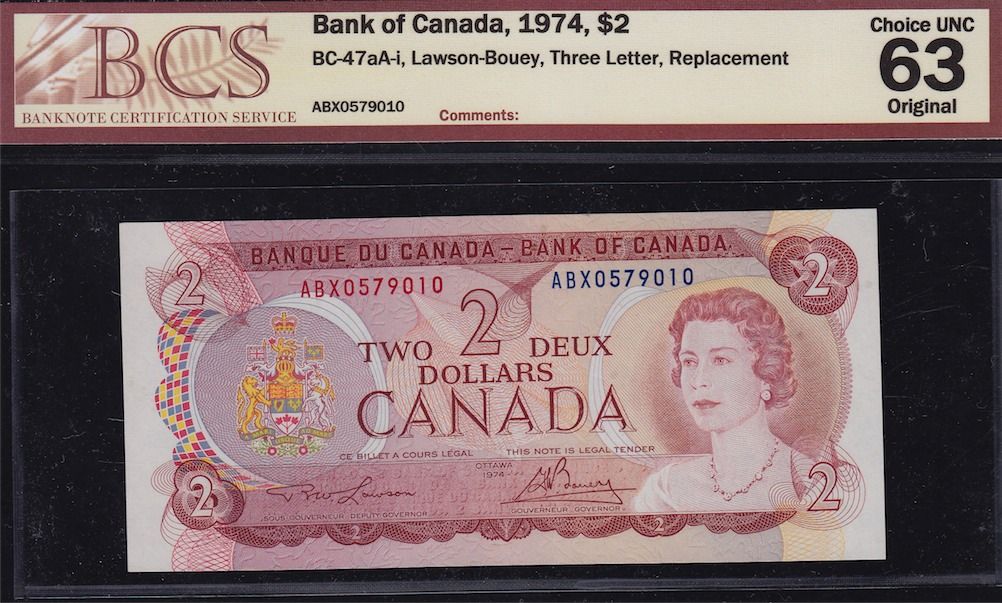 Lot of Three Bank of Canada Replacement Notes - Lot includes: CH BC-46aA-i UNC, S/N:AAX0178487. CH BC-46bA AU, S/N:EAX2472331. CH BC-47aA-i BCS Choice UNC 63 Original, S/N:ABX0579010. 3 Pcs.