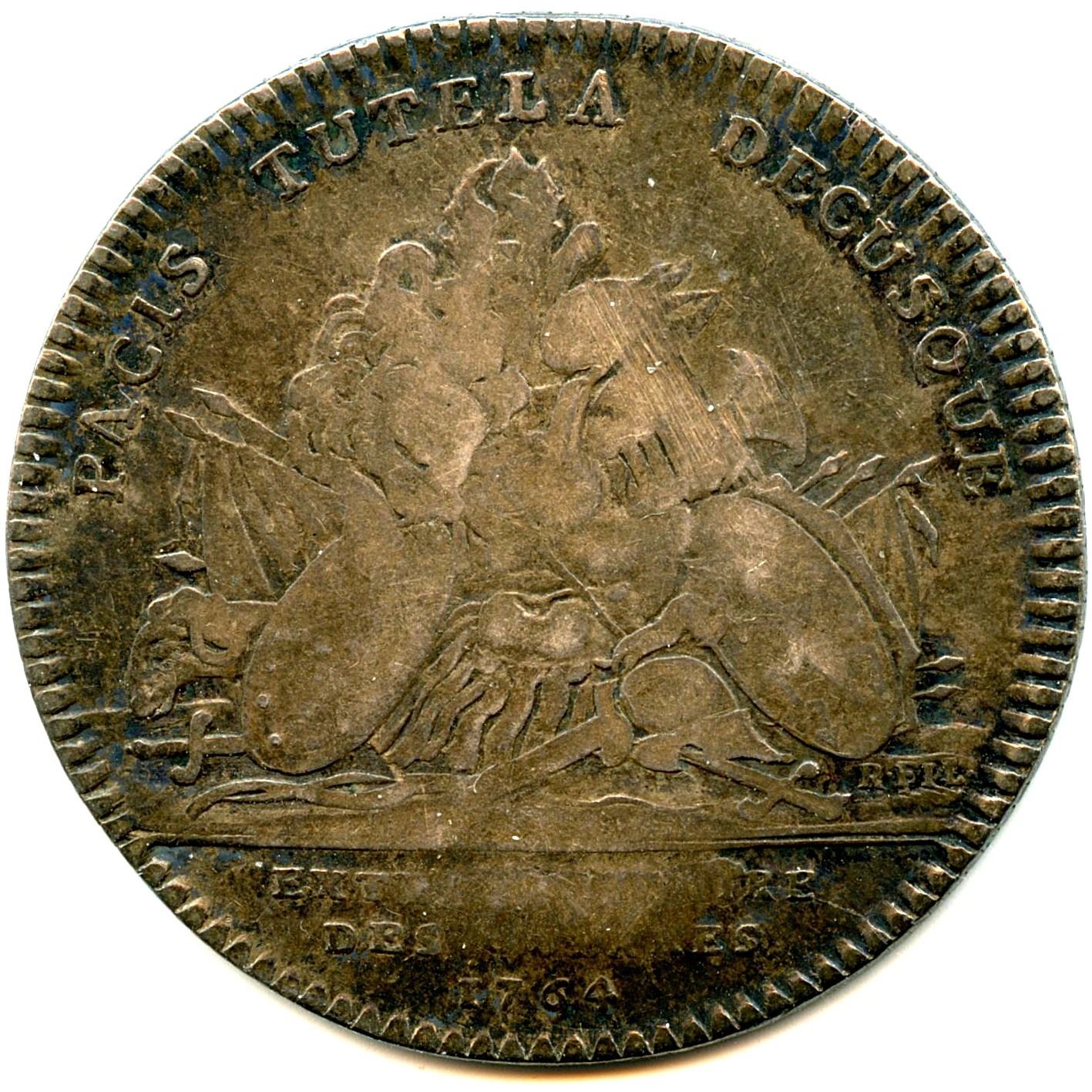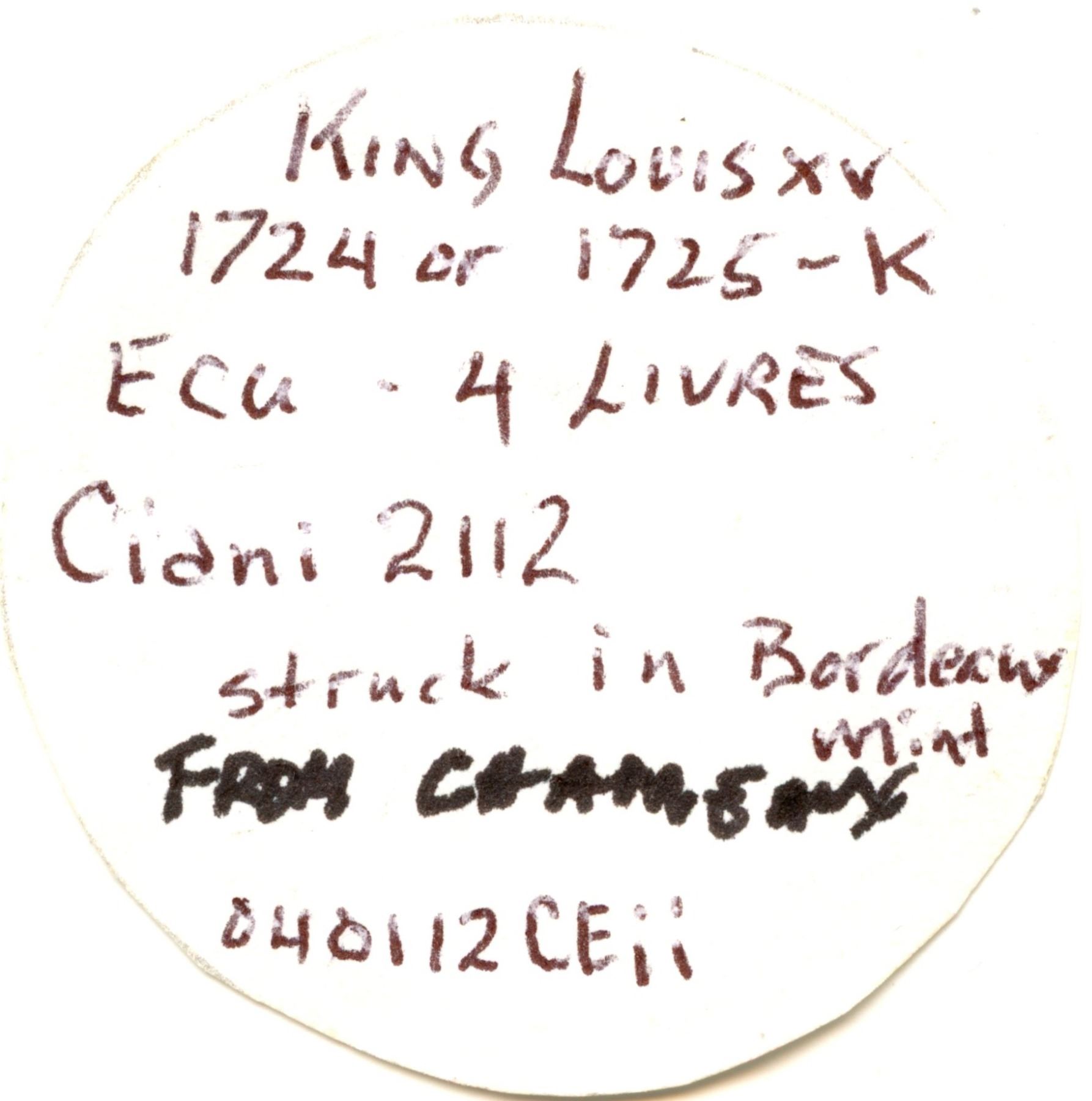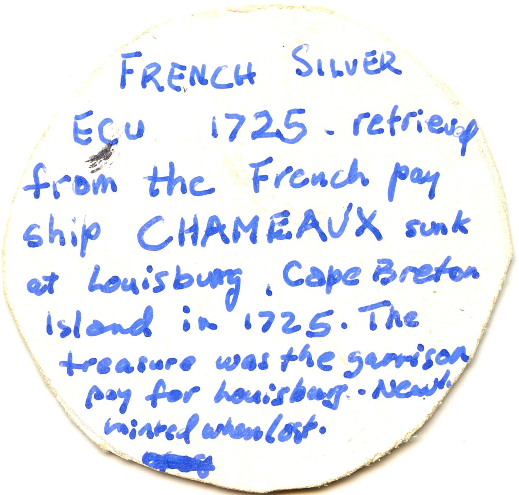 1725 1 Ecu, 14.90g, .917 Silver, retrieved from the ship Chameaux off Louisburg, Cape Breton Island; 1725 1 Ecu, 17.94g, .917 Silver, retrieved from the ship Chameaux off Louisburg, Cape Breton Island; 1764 Jeton Louis XV, Extraordinaire des Guerres, Silver, F. 3pcs. Note: this lot is part of The Harry N. James Collection.