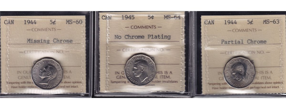 Lot of Three ICCS 1944/5 Five Cents - 1944 Missing Chrome ICCS MS-60 & Partial chrome MS-63. 1945 No chrome plating MS-64. 3 Pcs.