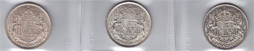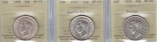 Lot of Three ICCS Graded Fifty Cents Includes: 1938 AU-55, 1943 Double Die 3 EF-45, 1950 Design MS-60. 3 Pcs.