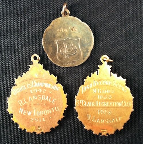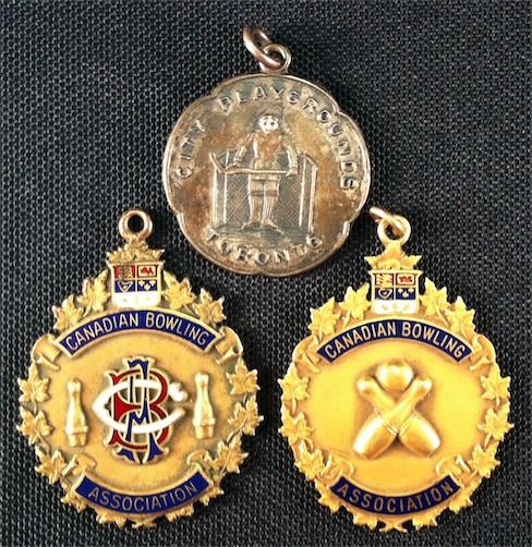 Two Canadian Bowling Association Gold Medals - 1938 High Record Score for 9 games, St. Clair Recreation Club 4059. 1942 Doubles Championship, New Toronto, 2511 - both issued to R. Lansdale and are 10k, total 24.4 gms. Also included in this lot Toronto City Playground, 1948, sterling, 7.5g. 3 Pcs.