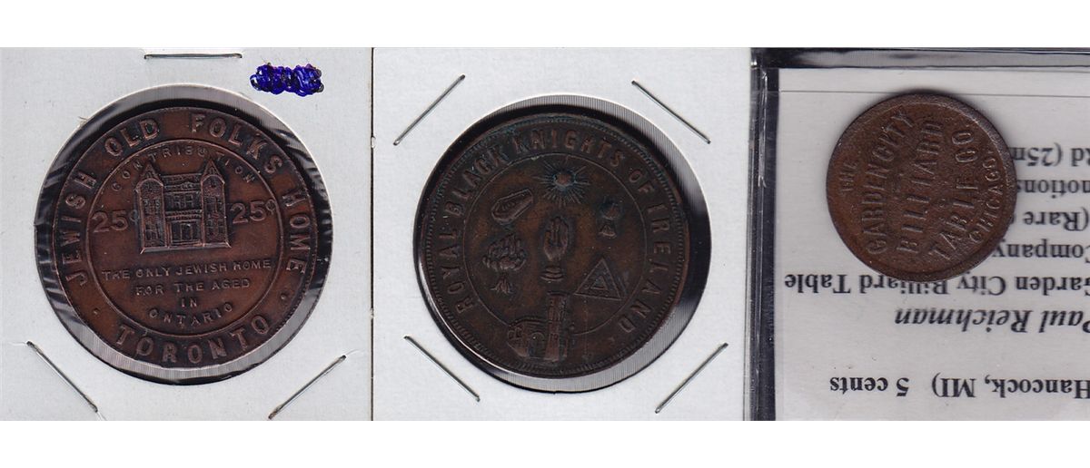 Lot of Three Tokens/Medals - Includes: Toronto Lodge Penny, Toronto Jewish Old Folks Home Medal, Garden City Billiards, Chicago, 5 Cent Token, 25 mm, brass. 3 Pcs.