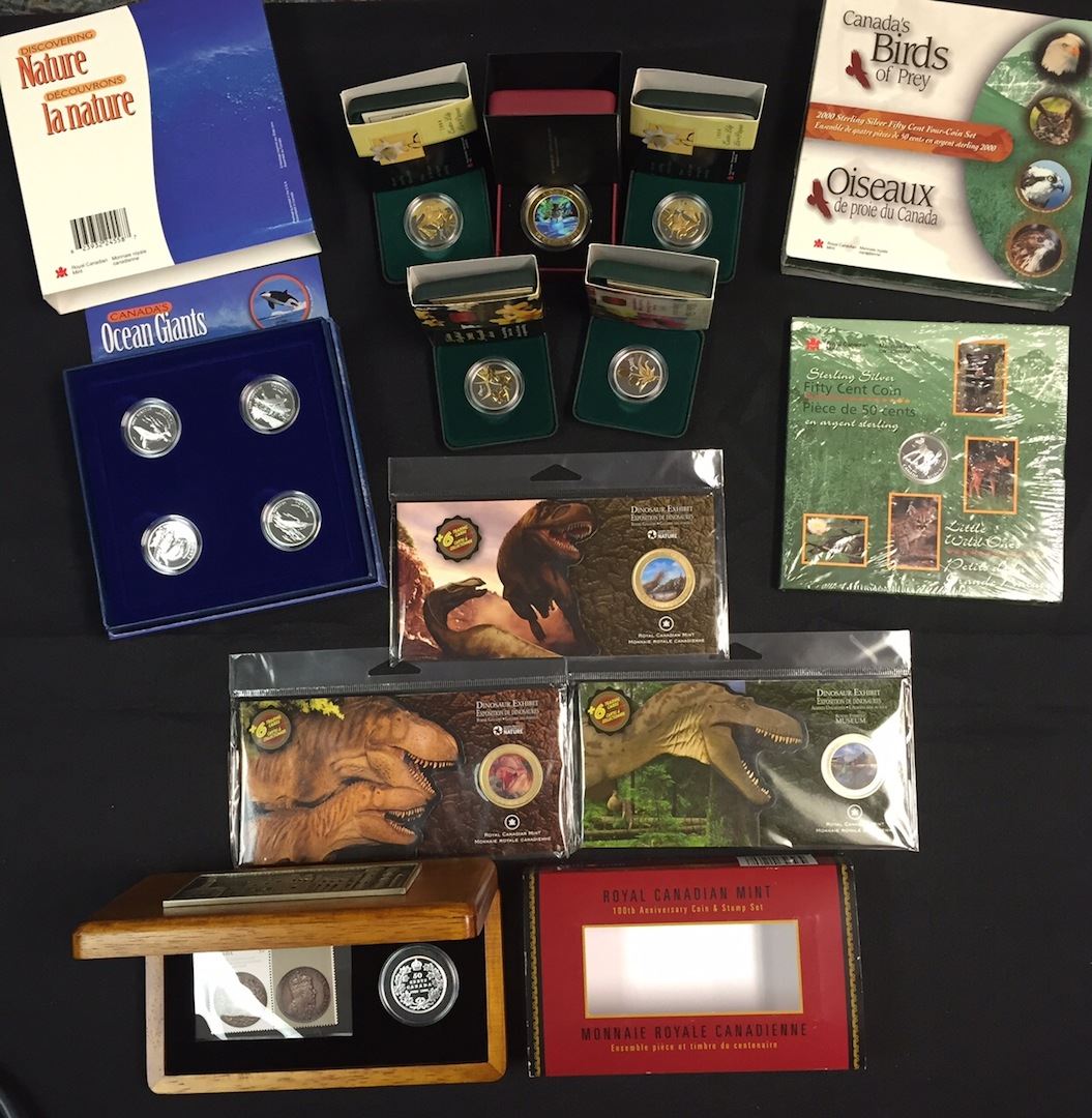 Lot of Twelve Fifty Cent Coins & Sets Includes: 1996 Baby Moose Calf, 1998 Whale Set, 2000 Birds of Prey Set, 2002 Golden Tulip, 2003 Golden Daffodil, 3 different X 2010 Dinosaur Exhibit, 2004 Easter Lily X 2, 2008 100th Anniversary Coin & Stamp Set, 2008 Holiday Snowman. 12 Pcs.
