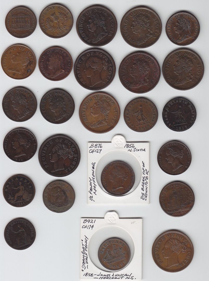 Lot includes: Br 867, 1823 Half Penny Token, F. (3) Br 868, 1824 One Penny Thistle Tokens, VG/F. Br 869, 1823 Half Penny Thistle Token, AVF. (2) Br 870, 1832 One Penny Thistle Tokens, F/VF. (3) Br 871, 1832 Half Penny Thistle Tokens, VG, F & EF. (3) Br 873, One Penny Thistle Tokens, F/VF. Br 874, Half Penny Thistle Token, F. (3) Br 876, 1856 Mayflower Half Penny Tokens, F/VF. (2) Br 879, 1814 Broke Tokens, VG/F. Br 881, 1814 Carritt & Alport, AVF. Br 883, 1815 Hosterman & Etter, VF. (2) Br 884, 1815 Starr & Shannon, VG/F. Br 886, 1815 Half Penny Token, VG. Br 921, Fisheries & Agriculture Half Penny Token, AVF. 25 Pcs.