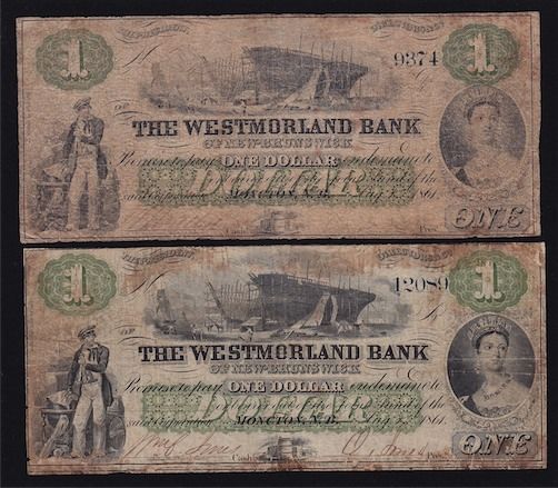 Lot of Two 1861 Westmorland Bank $1 Notes - CH 800-12-02, VG/F, S/N:9374/B; CH 800-12-02a, F with edge repairs, S/N:12089/B. 2 Pcs.
