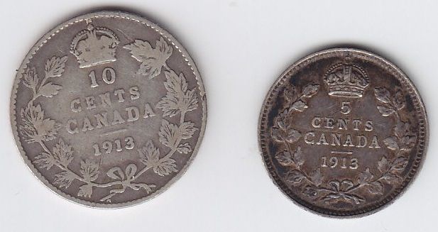 Lot includes: 1913 Five Cent, VF. 1913 Ten Cent, Broad Leaves, VG. 2 PCS.