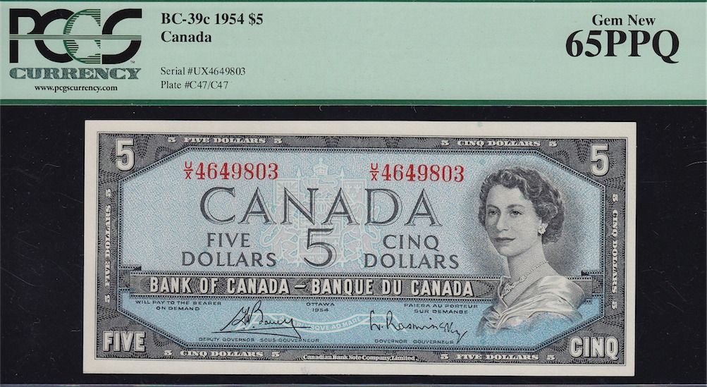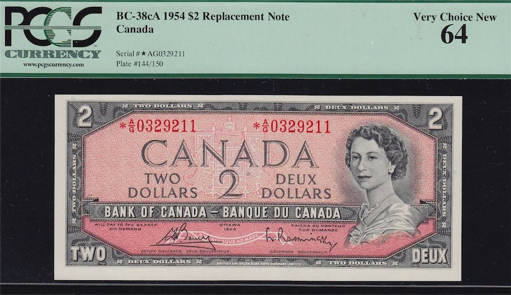 Lot of Two 1954 Bank of Canada Notes - CH BC-39c ($5) PCGS Gem New 65 PPQ. S/N:U/X4649803. BC-38cA ($2) Replacement, PCGS Very Choice New 64. S/N:*A/G0329211.