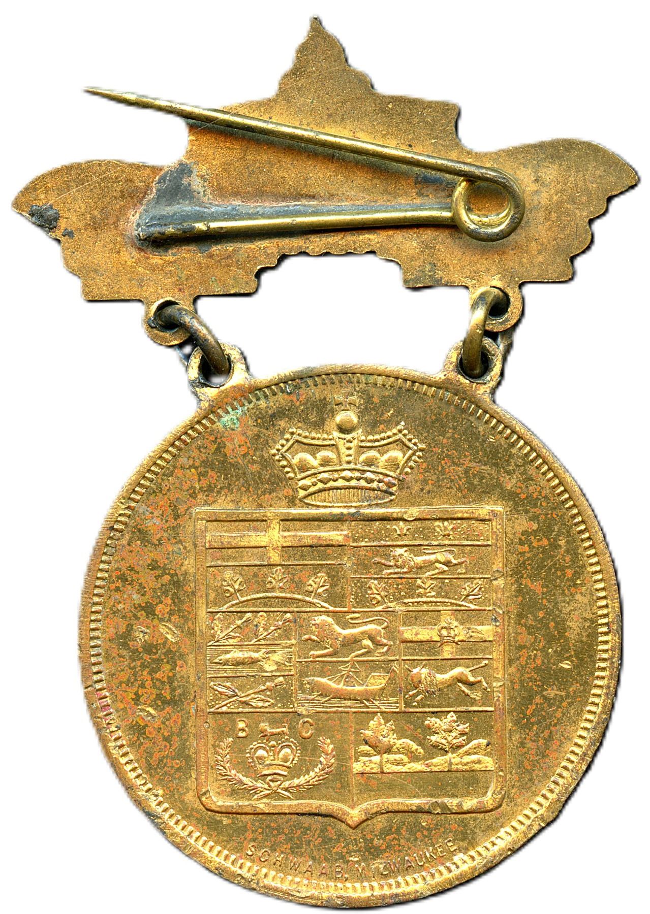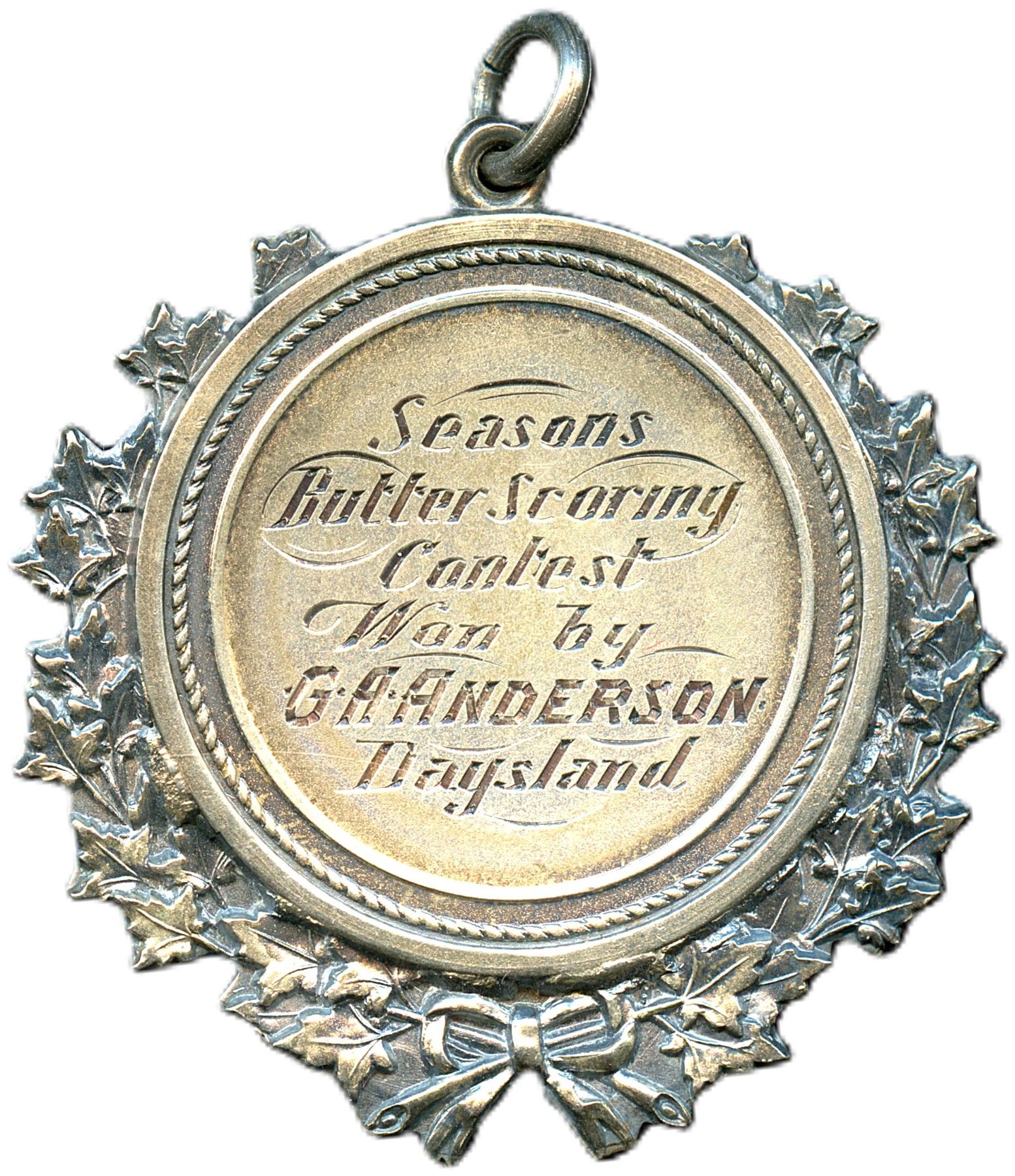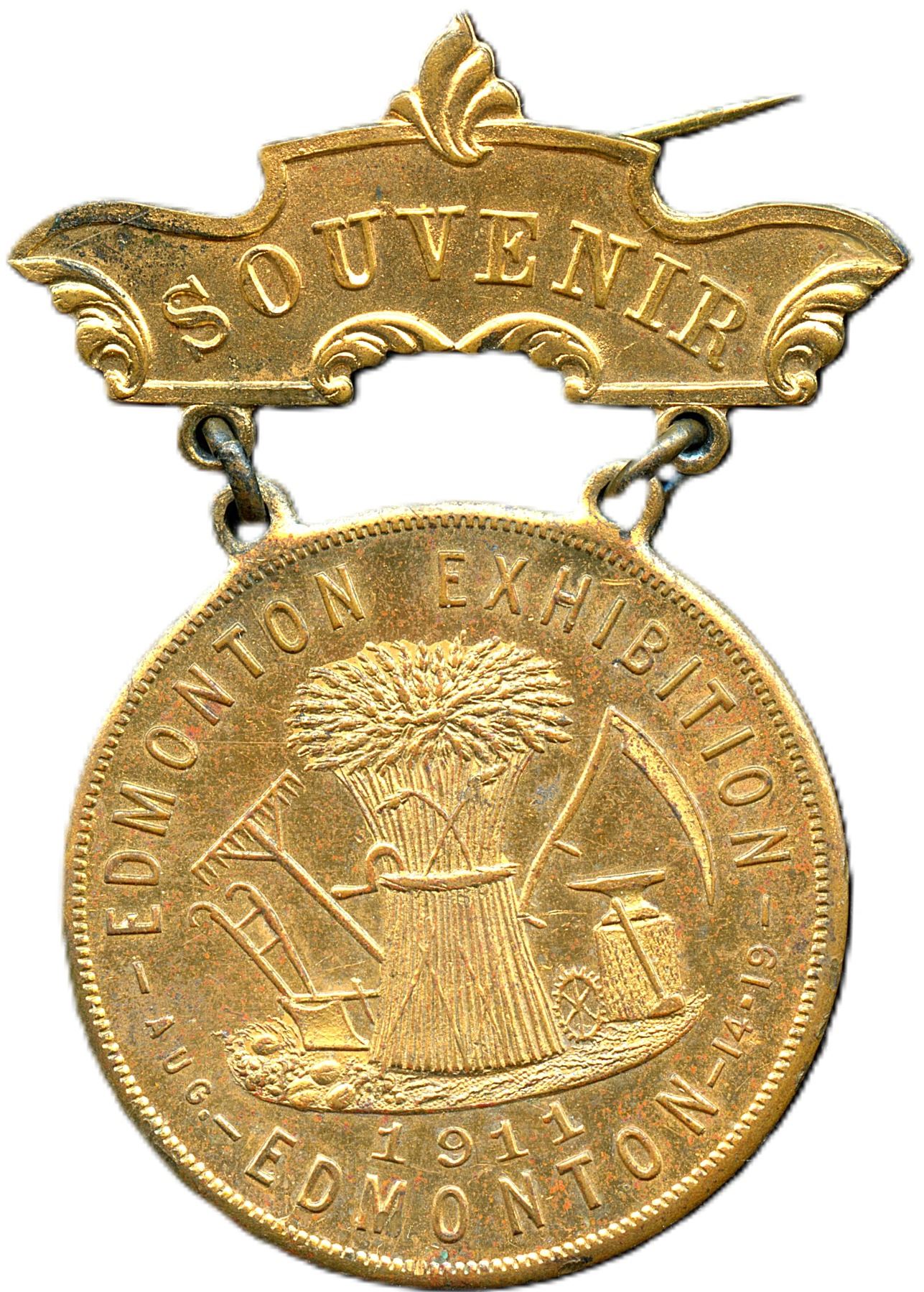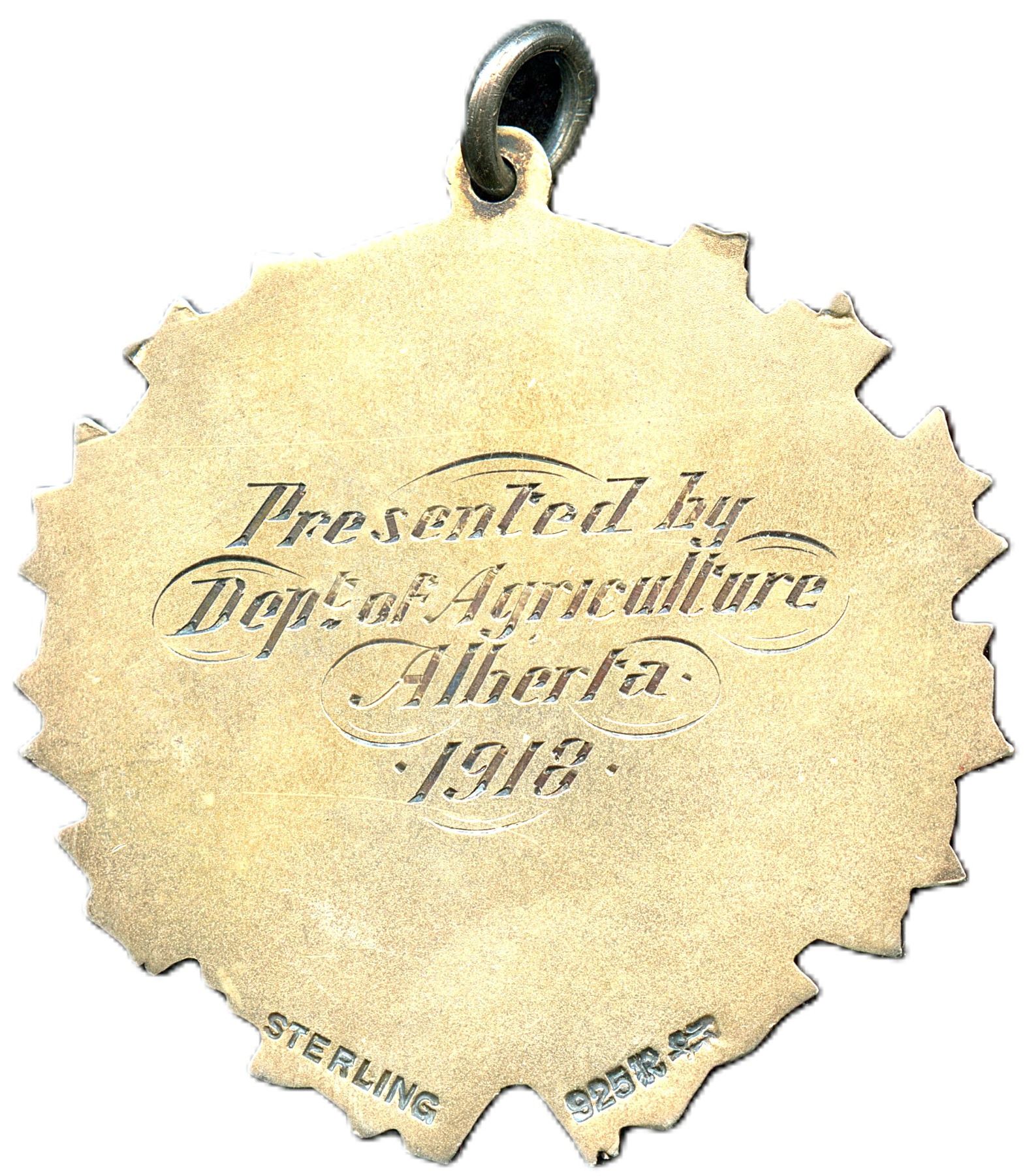 "Seasons Butter Scoring contest, won by G.A. Anderson Daysland" Presented bt Dept. of Agriculture, Alberta, 1918, Sterling silver, 42 x 43mm, 17.5g (0.5204ASW), EF, Ex.; CH-EABS-3, Souvenir of the Edmonton Exhibition 1911, Brass, 42 x 59mm, 17.5g, Hook on hanger is broken, EF. 2pcs. From the Geoffrey Bell Collection.