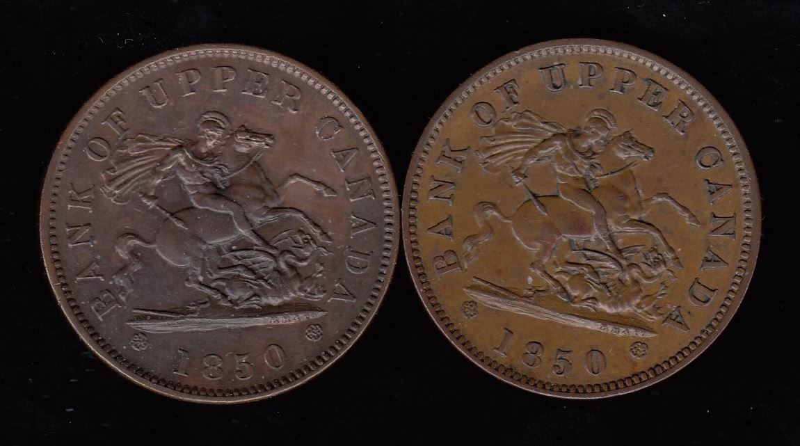 Lot of Two Bank of Upper Canada One Penny Tokens. Br. 719, Co209, CH-PC-6A1. 1850 Bank of Upper Canada One Penny. EF. 15.38g; Br. 719, Co219, CH-PC-6A2. 1850 Bank of Upper Canada with dot One Penny. EF. 15.69g. 2 pcs.
