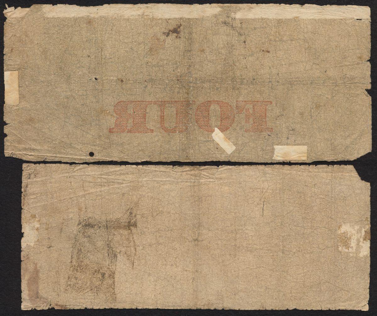 CH 765-10-02. $1 Good Condition, top left corner missing, some foxing. S/N 1947. CH 795-10-12. $4 AG Condition, 3 holes, edge tears and tape repairs on back. *