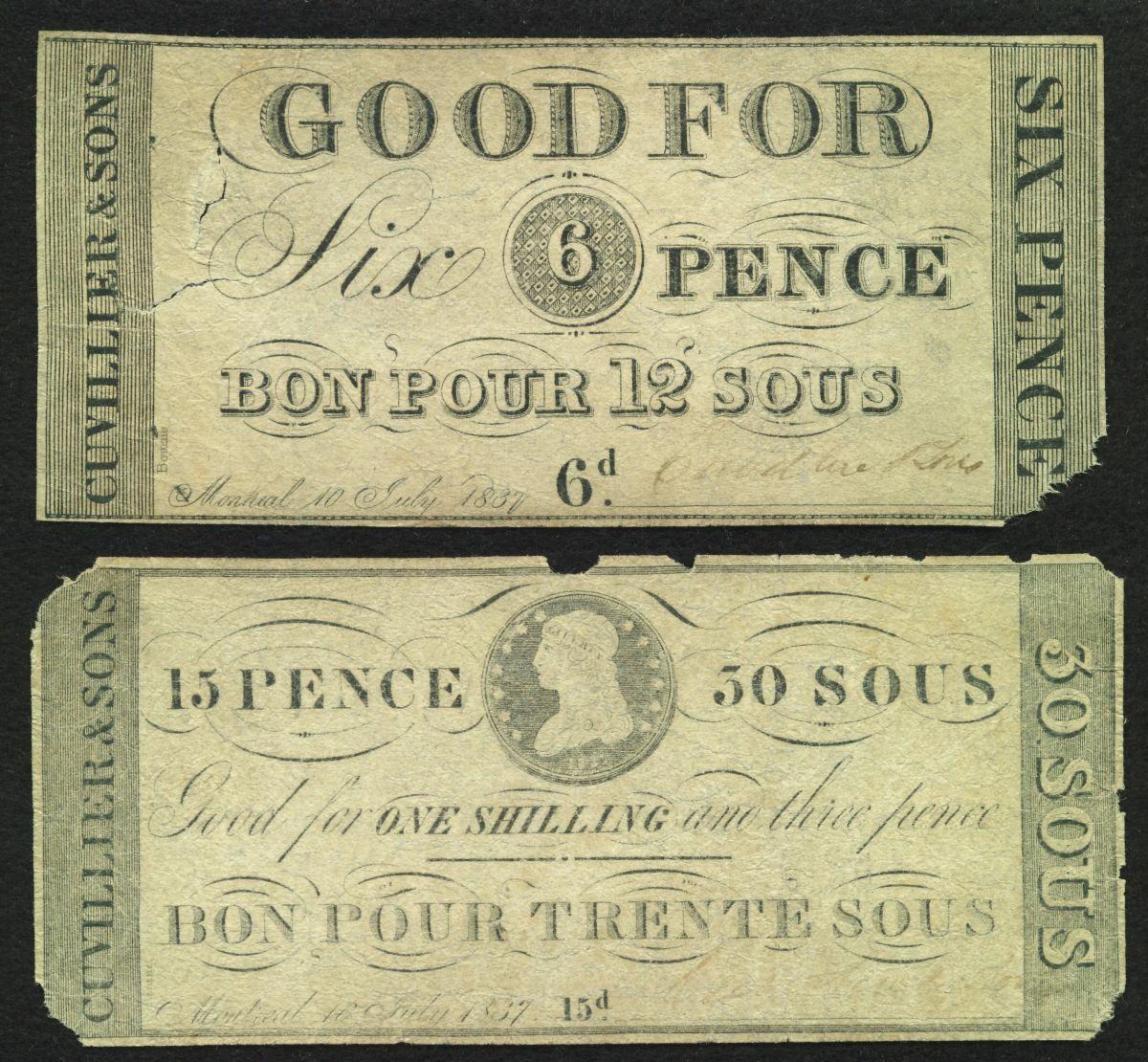 CH QC 105-10-04, 12 sous, lower right corner off, VG-F; QC 105-10-08, 15 pence, all corners off, rough top edge, VG.*