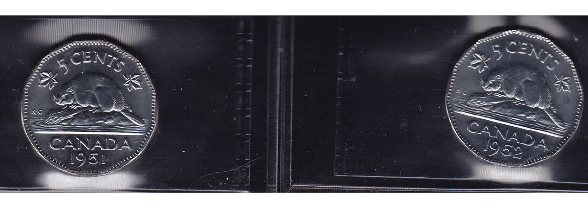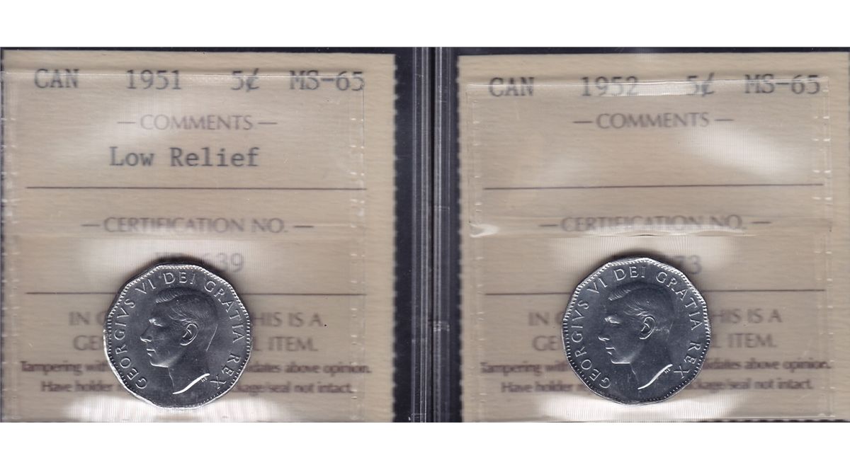 Lot of Two Five Cents - Dates include: 1951 Low Relief, 1952. Both ICCS MS-65. 2 Pcs.