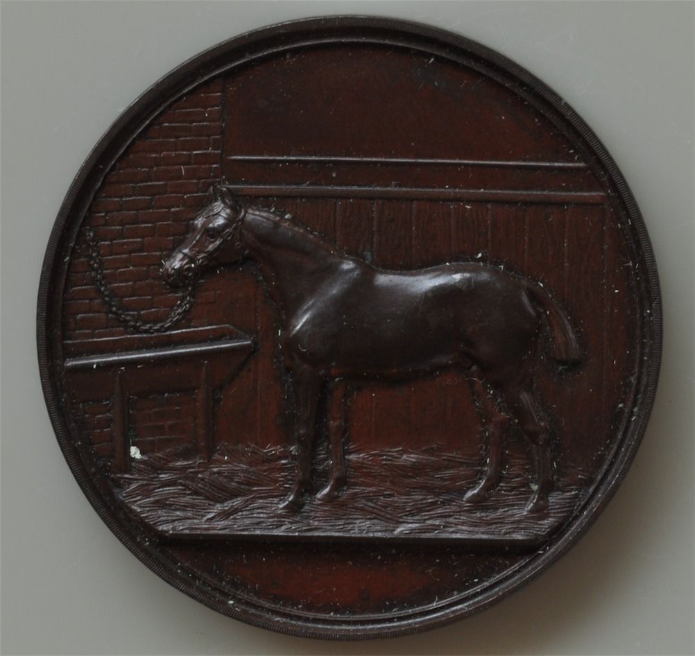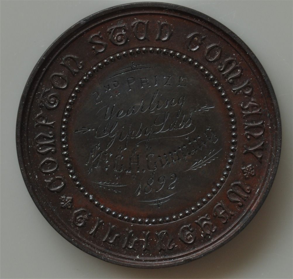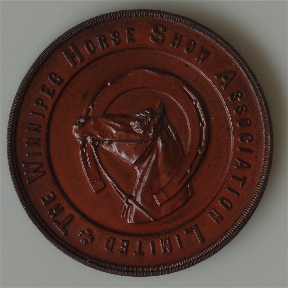 Lot of Two Horse Medals - Obv. The Winnipeg Horse Show Association Limited. Rev. Wreath, blank in the center for award engraving. CU, 47mm, UNC. 2 - Obv. Compton Stud Company Gillingham (England) 2nd Prize/Yearling/Gipsy Lass/Mr. C.H. Cunning/ 1892 Rev. Engraving of a horse. CU, 52mm, UNC. 2 Pcs.