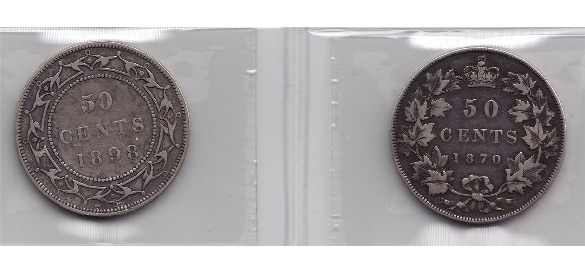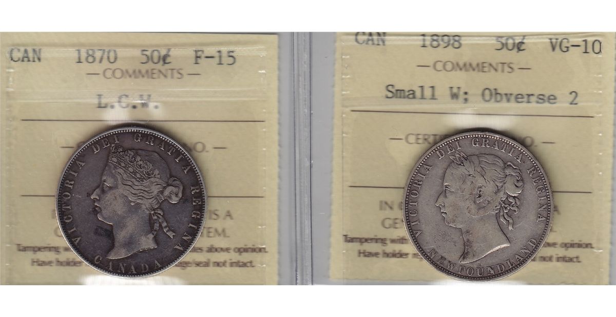 Dates include: 1870 L.C.W. F-15; 1898 VG-10 Small w, Obv 2. 2 Pcs.