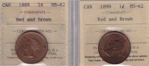 Dates include: 1888 MS-62 Red and Brown. 1899 MS-62 Red and Brown. 2 Pcs.