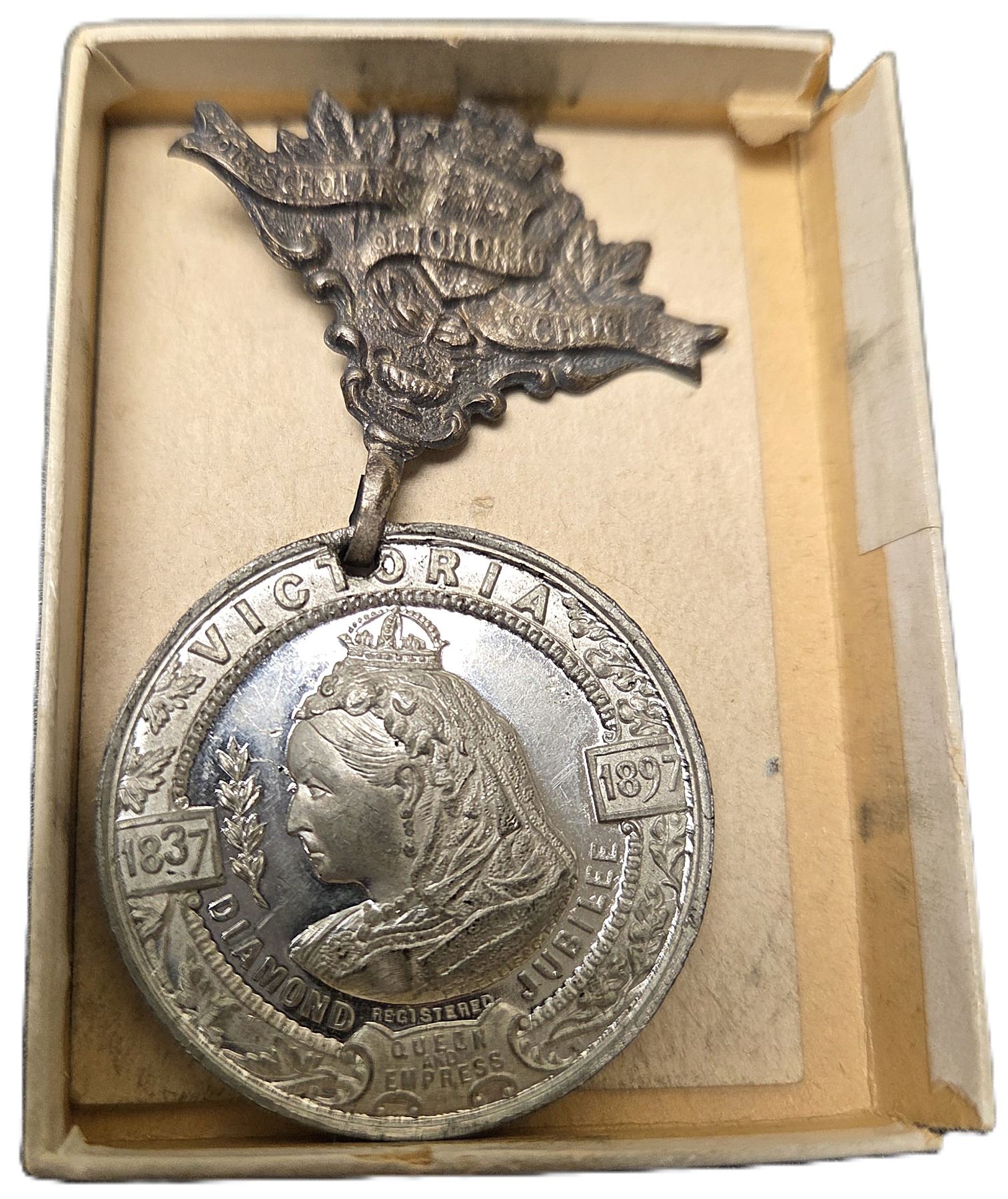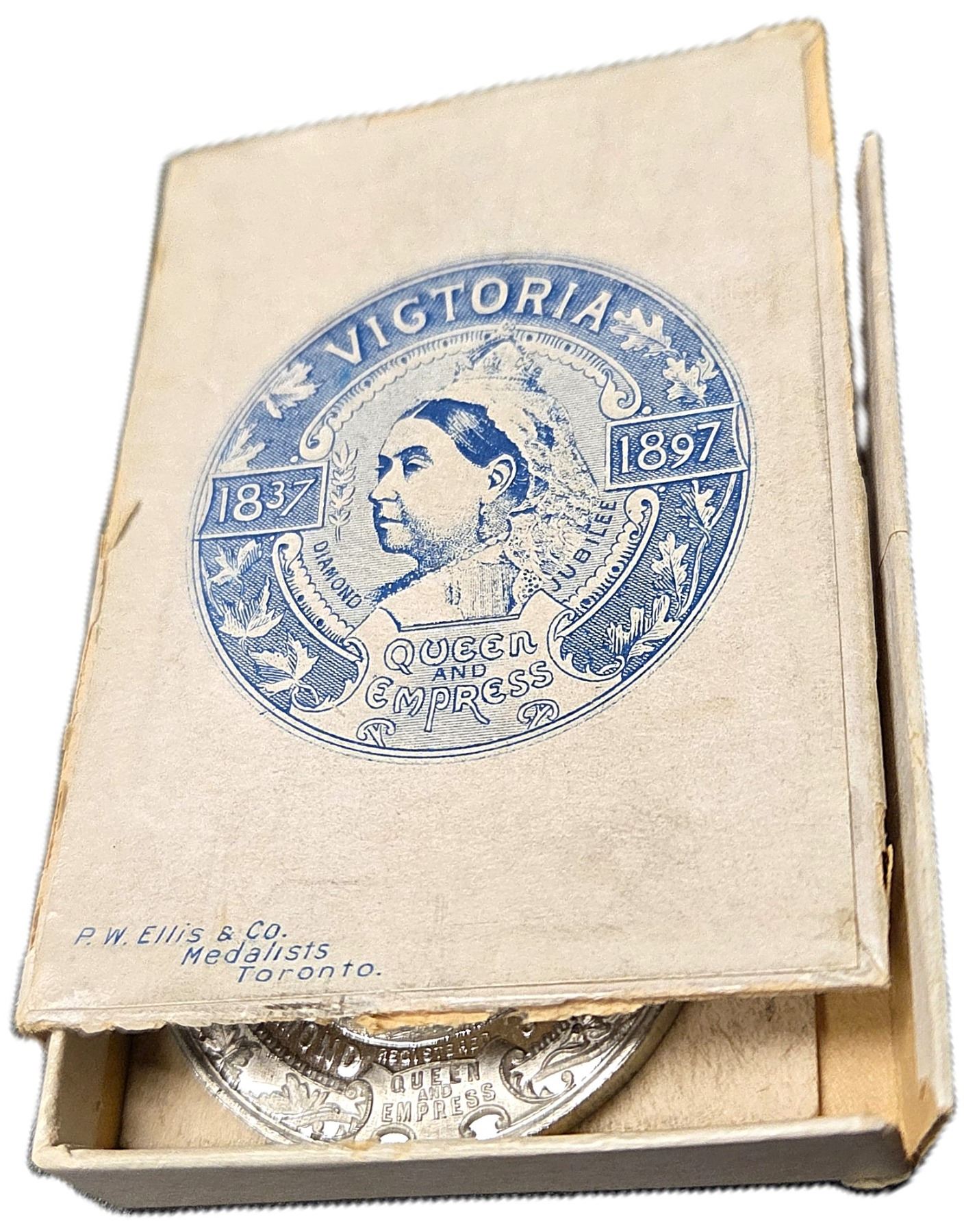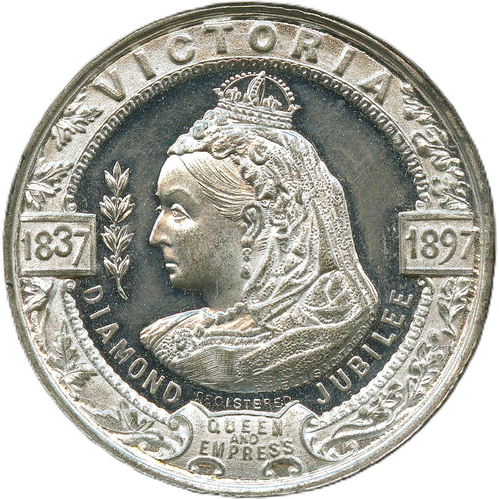 Lot of Two Lr. 1875n Queen Victoria Diamond Jubilee White Metal Medals. 24.8mm, 14.9g. In original round cardstock box. Box is in good condition, UNC; 54.5mm, 14.8g. With Original Suspension. In original rectangle box, box is missing two flaps. UNC. 2pcs.
