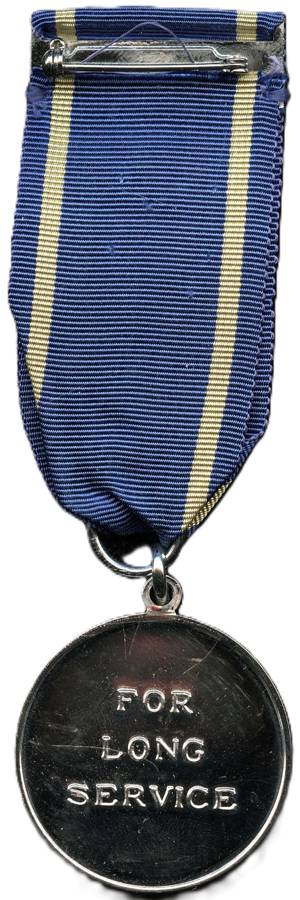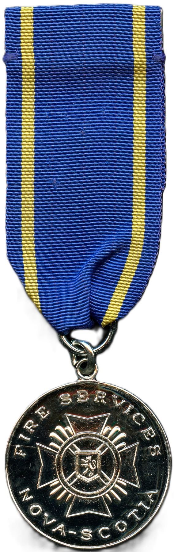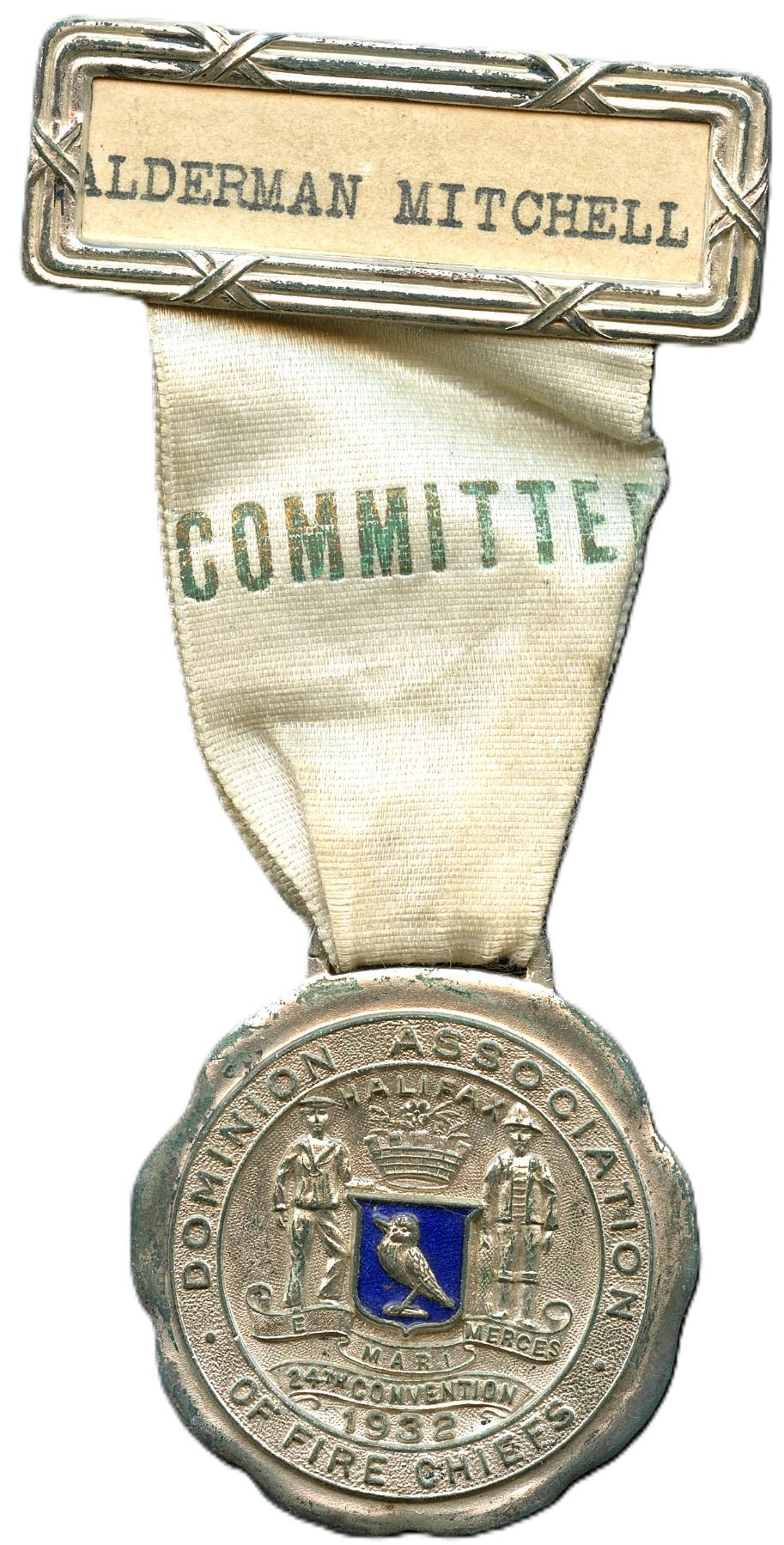 Dominion Association Of Fire Chiefs Halifax 1938 Committee Badge, White Metal. Pin Bar "Alderman Mitchell" on a cardstock insert, White Ribbon "Committee", Suspension Loop on medal, 51 x 104mm, Ribbon in good condition, Medal in EF; Nova Scotia Fire Service For Long Service, is a notable commendation awarded to firefighters in Nova Scotia, in recognition of their extended service, ribbon colour blue with two yellow stripes. Nickel Plated Copper, 34 x 108mm. UNC. 2pc. From the Geoffrey Bell Collection.