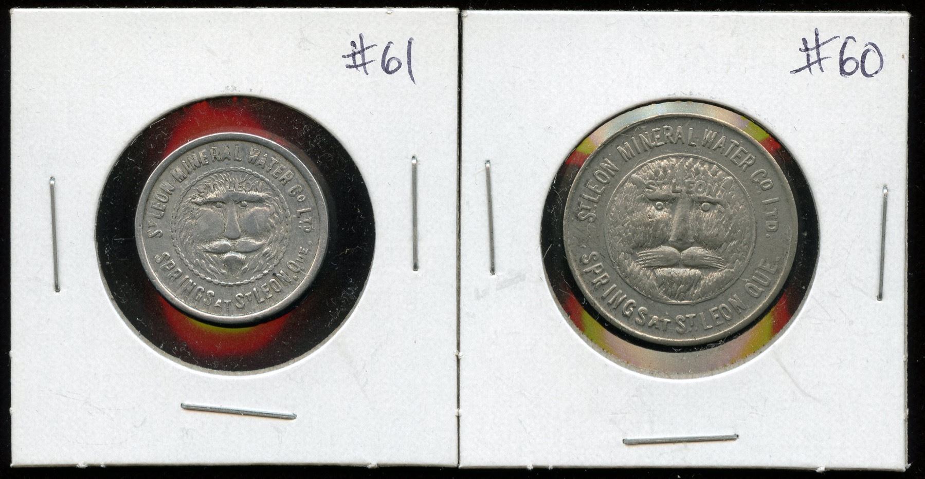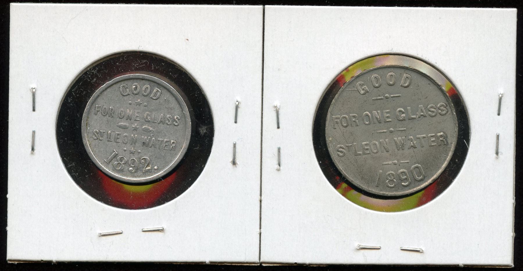 Lot of 2 St Leon Mineral Water Co Ltd (Quebec) Tokens: 1892 Aluminum small diameter, Br 619; and 1890 White Metal larger diameter, Br 618. 2 Pcs.