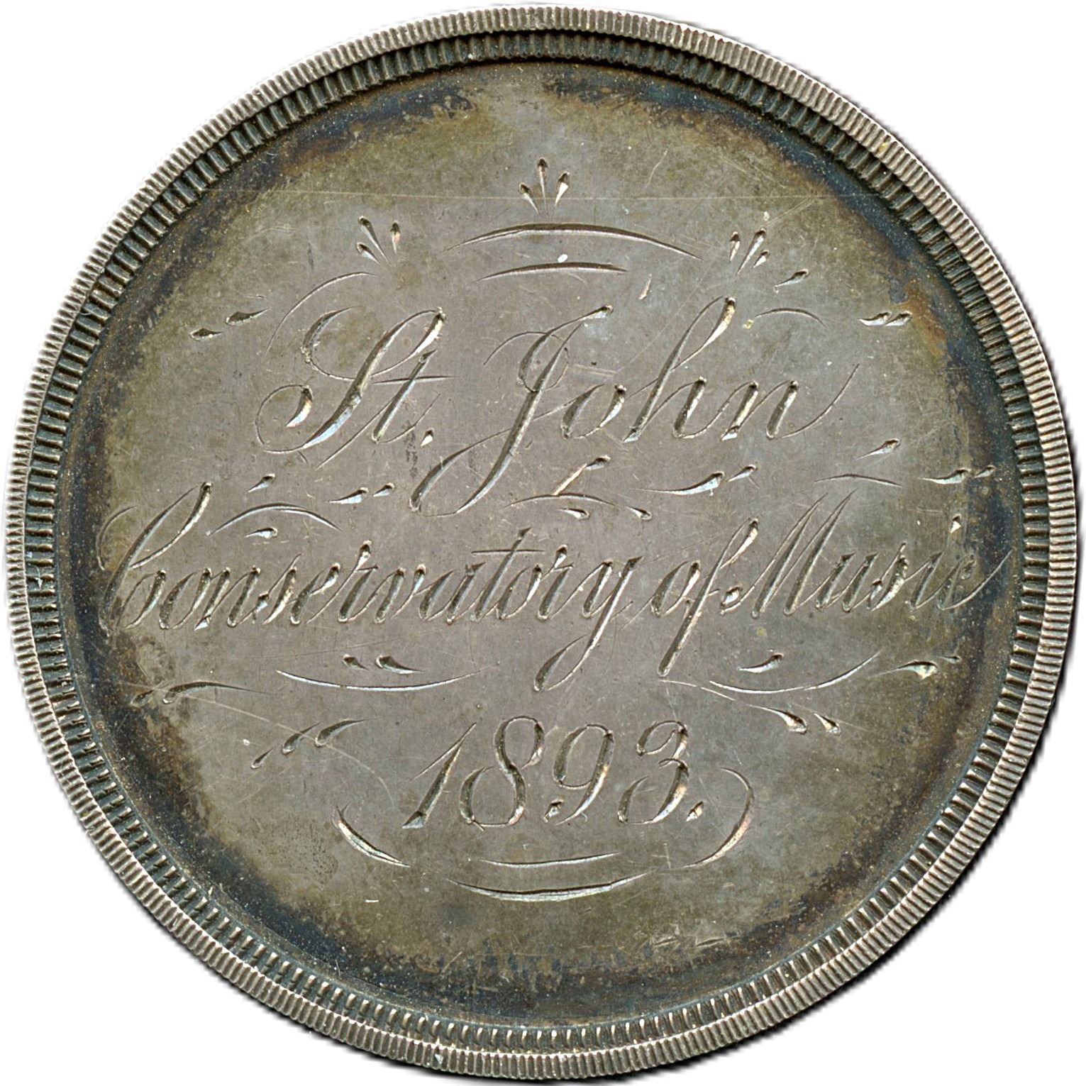 Central Madras School Reward of Merit. Awarded to Annie Taylor. 32 x 42mm, 14.1g, Suspension swivels, Silver, VF; St. John Conservatory Of Music 1893. Signed P.W. Ellis, 32mm, 16.1g, Silver, EF. 2pcs. From the Geoffrey Bell Collection.