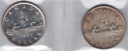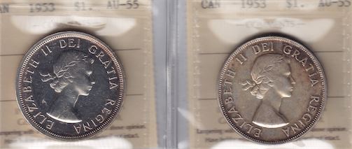 Lot of Two Varieties of 1953 Silver Dollars Both ICCS Graded AU-55. Shoulder fold and no shoulder fold. 2 Pcs.
