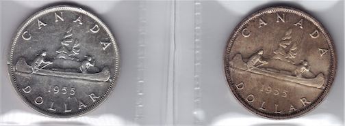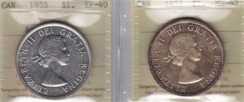 Lot of Two Varieties of 1955 Silver Dollars Both ICCS Graded: EF-40, Arnprior. MS-63, toned. 2 Pcs.