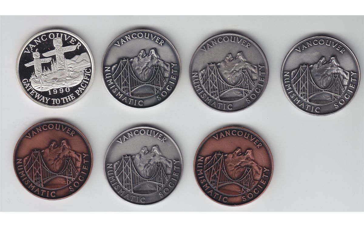 AR 38mm (4), AE 38mm (2). All awarded, 1975-1984, EF. Vancouver trade $20, Proof One Ounce round for CNA 1990. Portrait of Young Victoria / Totem Poles. Choice. 7 Pcs.
