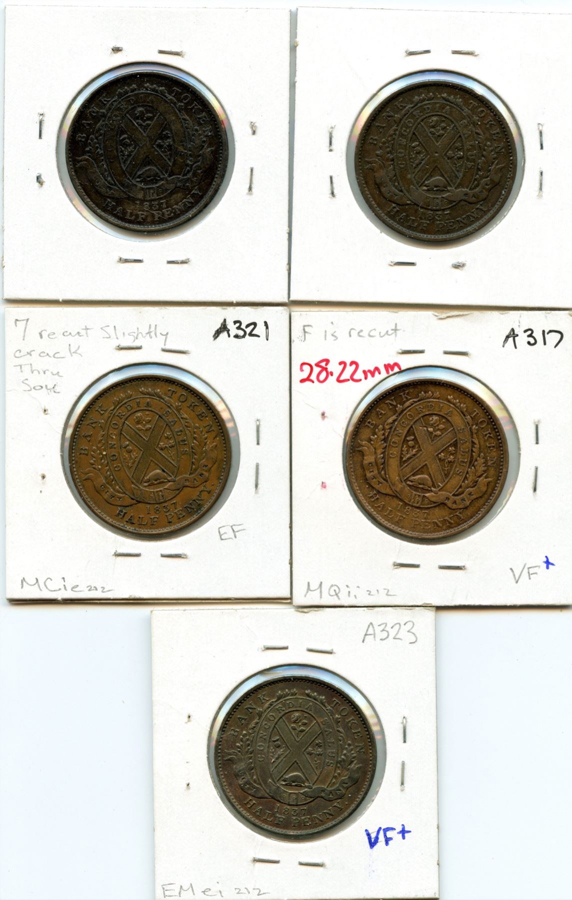 CH LC-8A1, Courteau 1g,VG; CH LC-8A1, Courteau 1g, F; CH LC-8A1, Courteau 1h, EF; CH LC-8A1, Courteau 1i, VF+; CH LC-8A1, Courteau 1k, VF+. 5pcs.