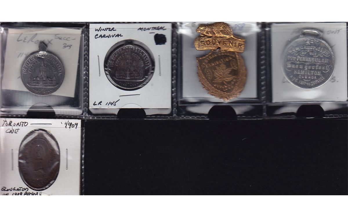 Lot of five Medals - Ler 1145 WM, EQCC-39 WM, EONS-57 Brass, Ler 1635B Alum and a 1909 Canadian Large Cent elongated 1909 CNE Lucky Cent. VF-UNC. 5 Pcs.
