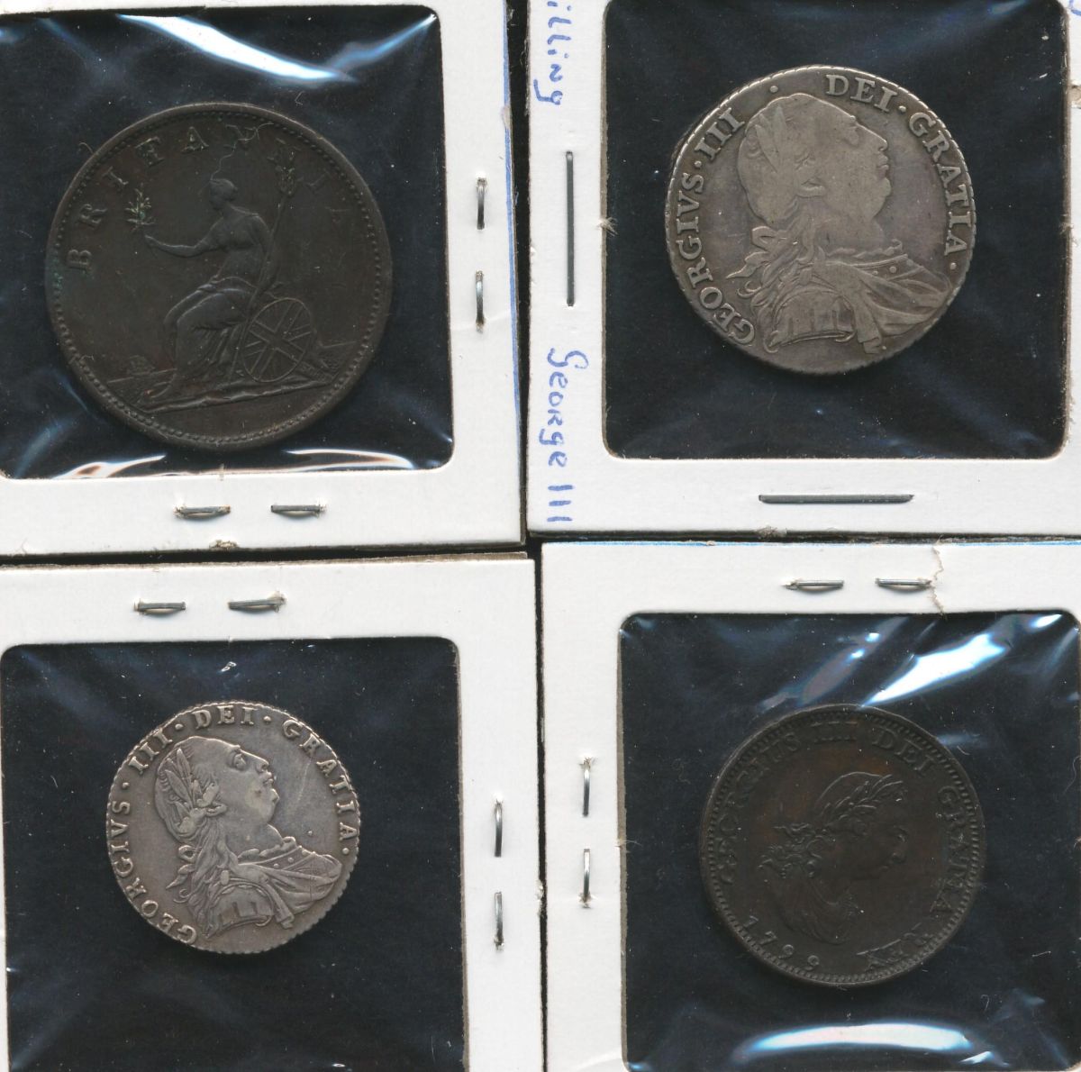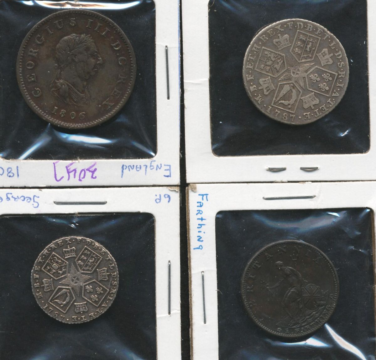 George III (1760-1820) Shilling 1787, F SCBC 3790. George III (1760-1820) Sixpence 1787, VF SCBC 3749 obv. Scratch 5:00. George III (1760-1820) Half Penny 1806, VF SCBC 3781. George III (1760-1820) Farthing 1799, EF SCBC 3778.