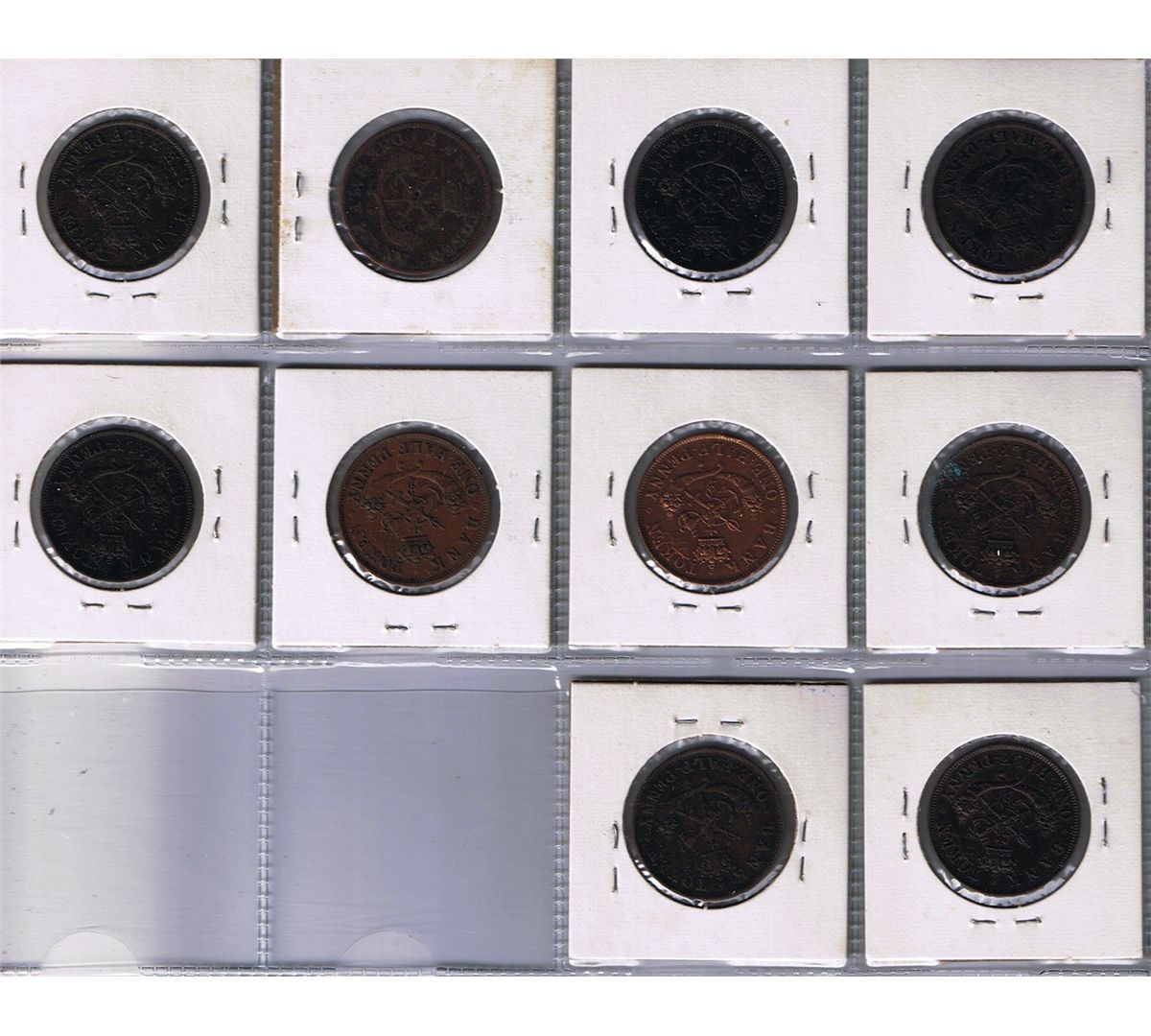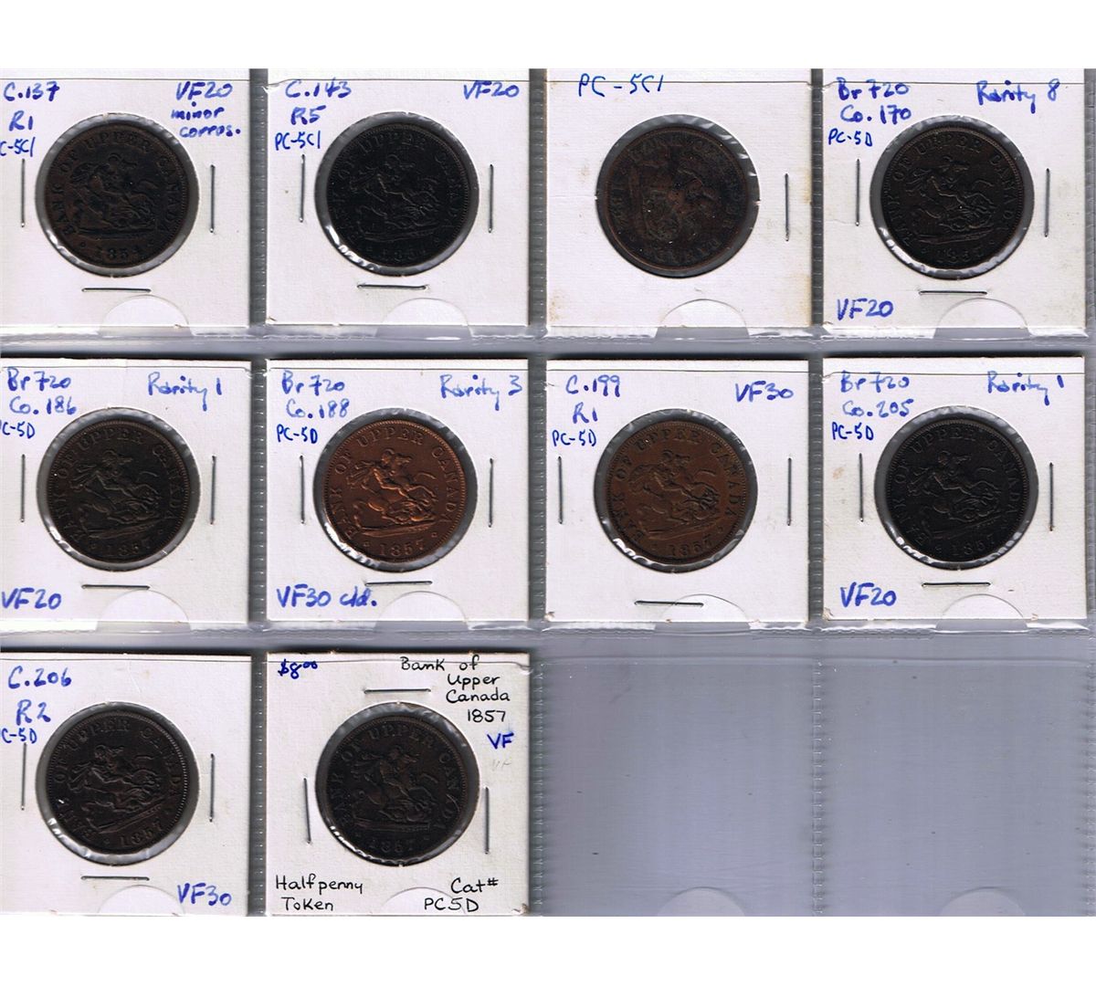 Lot of ten Bank Of Upper Canada Half Penny Tokens, BR 720. - Includes: (3) 1854, CH PC-5C1, (7) 1857, CH PC-5D. A great lot representing Courteau varieties. Some with problems. VG to EF. 10 Pcs.