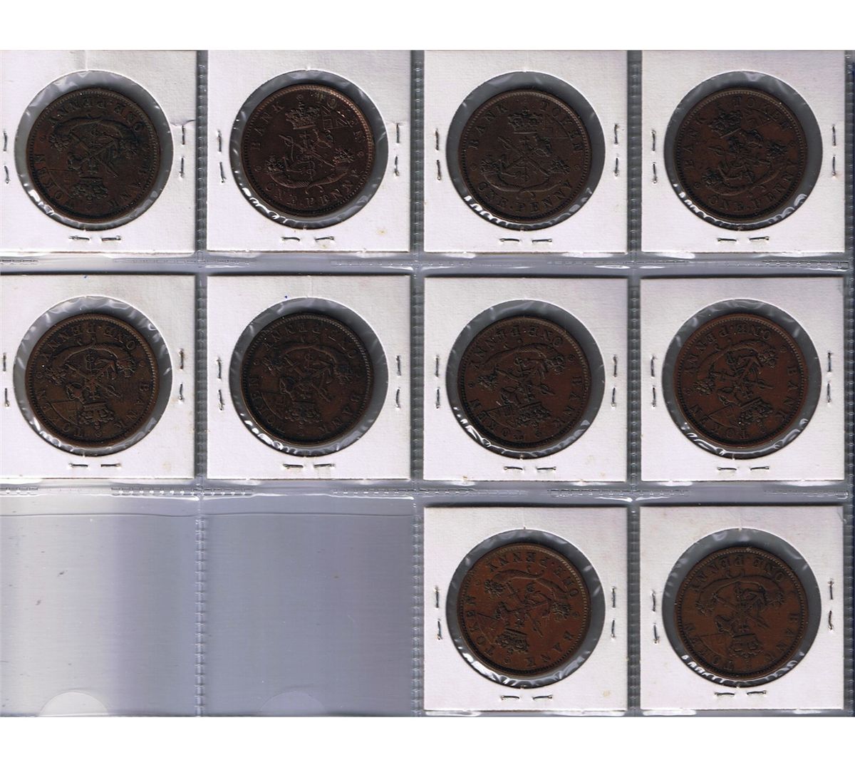 Lot of ten Bank Of Upper Canada Penny Tokens, BR 719. - Includes: (1) 1852, CH PC-6B1, (4) 1852, CH PC-6B2, (3) 1852, CH PC-6B4, (2) 1852, CH PC-6B5. A great lot representing Courteau varieties. Some with problems. VG to EF. 10 Pcs.