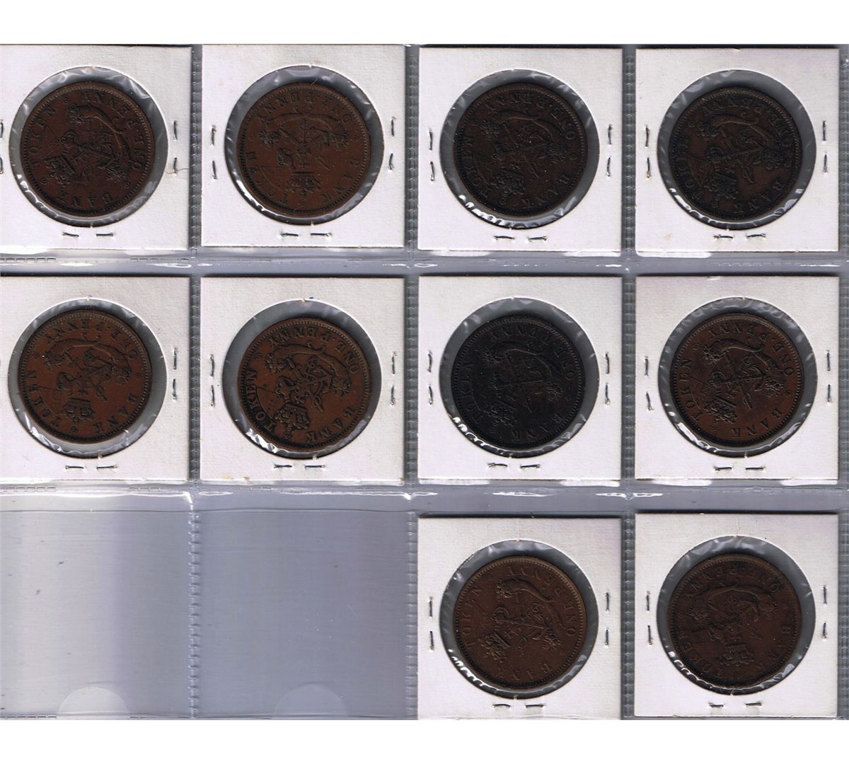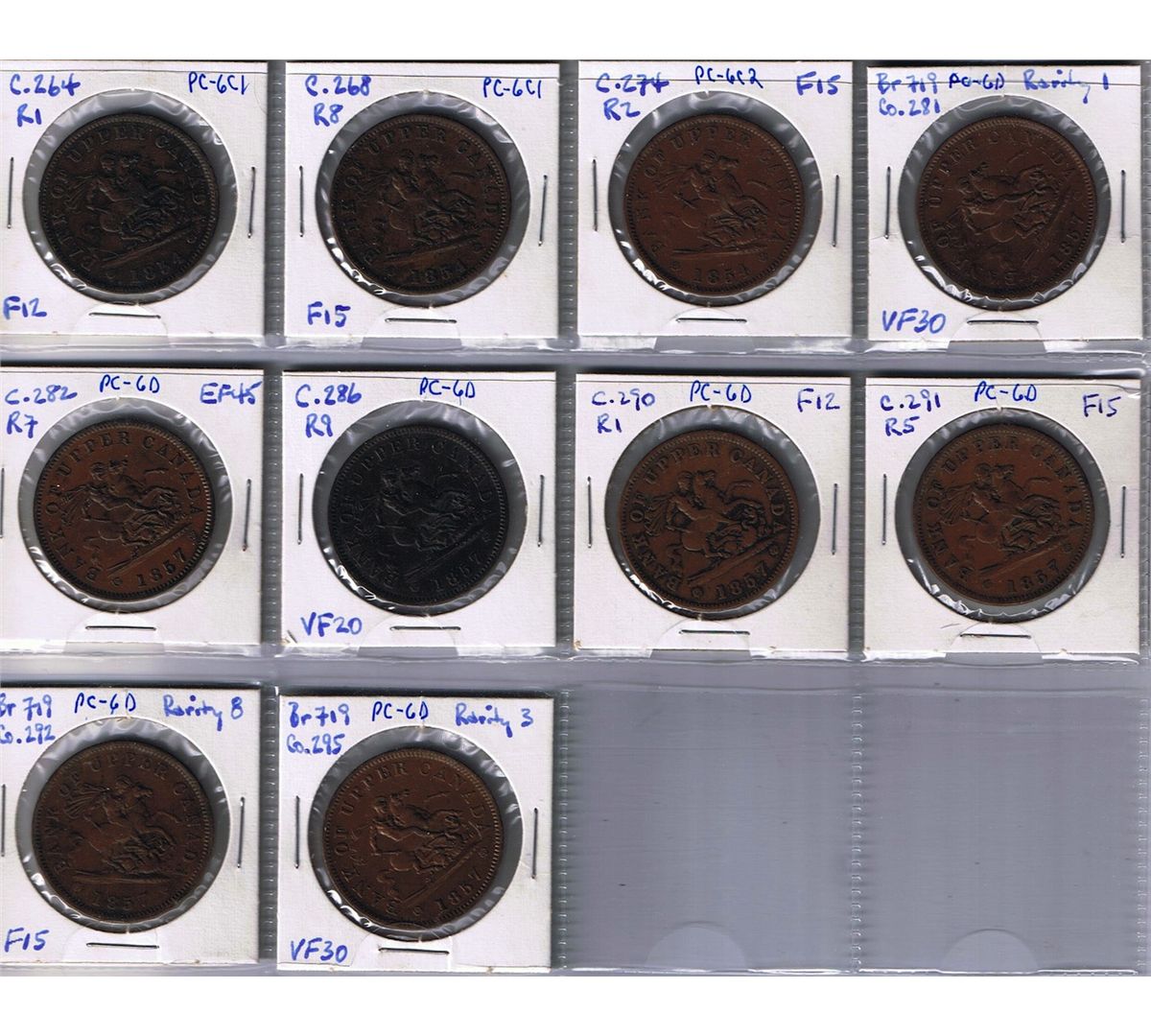Lot of ten Bank Of Upper Canada Penny Tokens, BR 719. - Includes: (2) 1854, CH PC-6C1, (1) 1854, CH PC-6C2, (7) 1857, CH PC-6D. A great lot representing Courteau varieties. Some with problems. VG to EF. 10 Pcs.