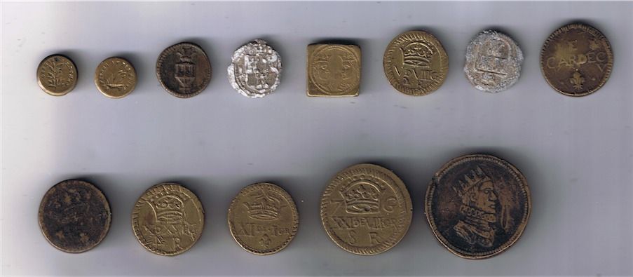 Lot of thirteen possible French Coin Weights. Includes: 1/4 Louis d'or (c1689) 2.021g, 31.19grains, 12mm. 1/4 Louis d'or (c1689) 2.046g, 31.56grains, 12mm. 1/2 Louis d'or 3.792g, 58.49grains, 16mm. Unknown 5.825g, 89.89grains, 17mm, Lead. Double-Ducat (?) 6.93g, 106.95grains, 15mm. 2 Real, 6.959g, 107.39grains, 19mm. Louis d'or (1689) 7.713g, 119.03grains, 18mm, Lead. 1 Teston 9.379g, 144.74grains, 21mm. Unknown 13.550g, 209.11grains, 21mm. 4 Real 13.787g, 212.77grains, 21mm. Johannes (1714) 14.144g, 218.28grains, 20mm. 8 Real 27.387g, 422.65grains, 27mm. Ducatoon 31.319g, 483.33grains, 30mm. G-EF. 13 Pcs.