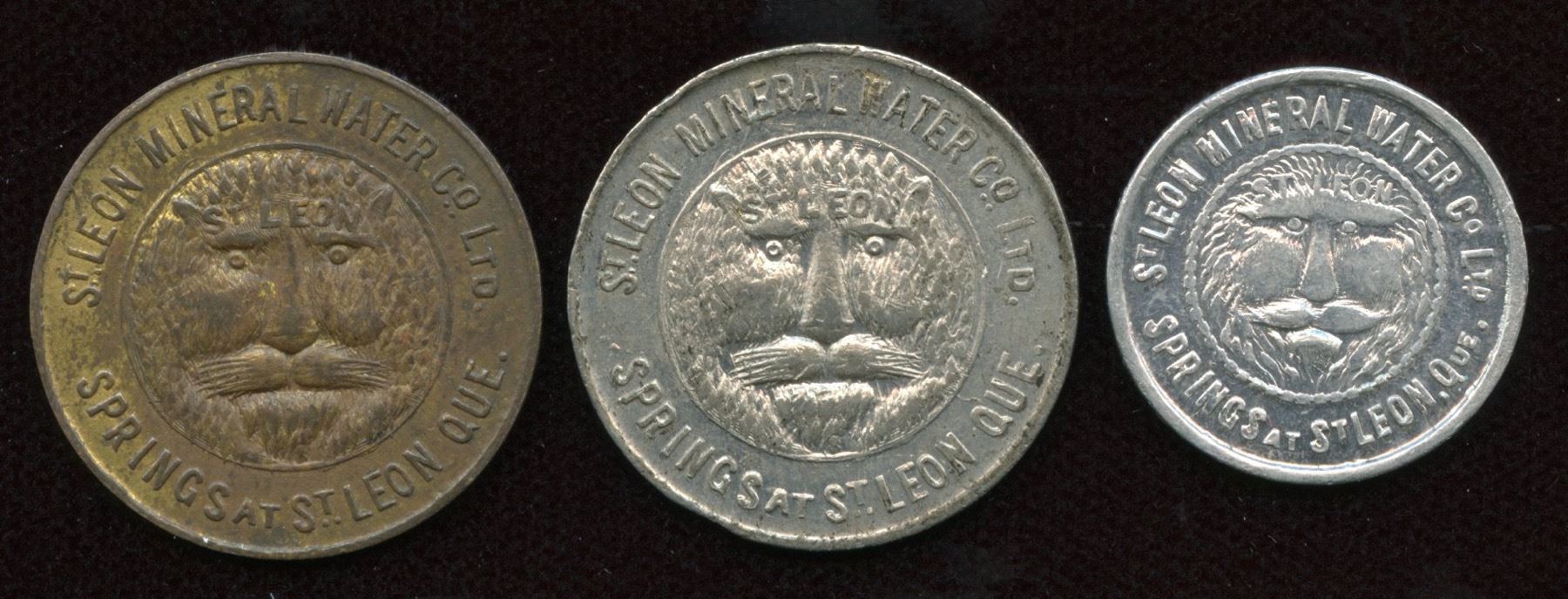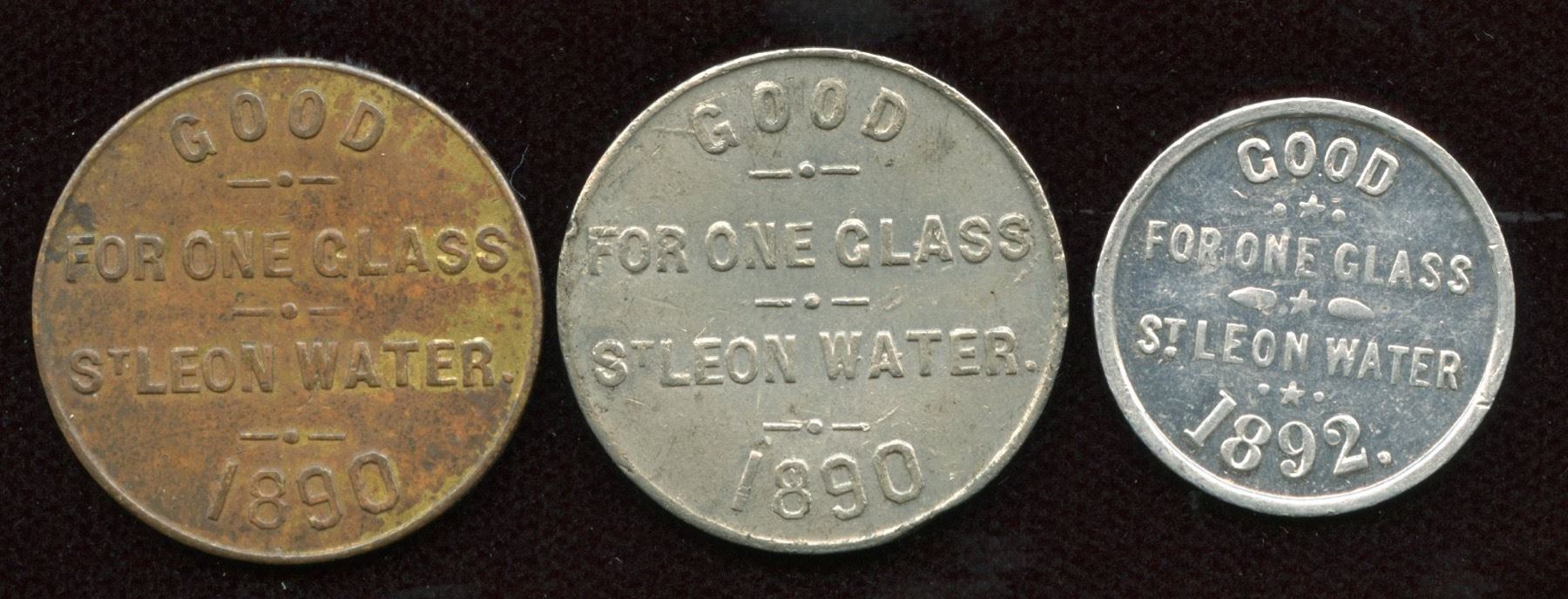 Br. 618, St. Leon Water, 1890, St. Leon, brass, EF; Br. 618, St. Leon Water, 1890, St. Leon, WM, Unc; Br. 619, St. Leon Water, 1892, St. Leon, Alum., Unc. 3 Pcs.