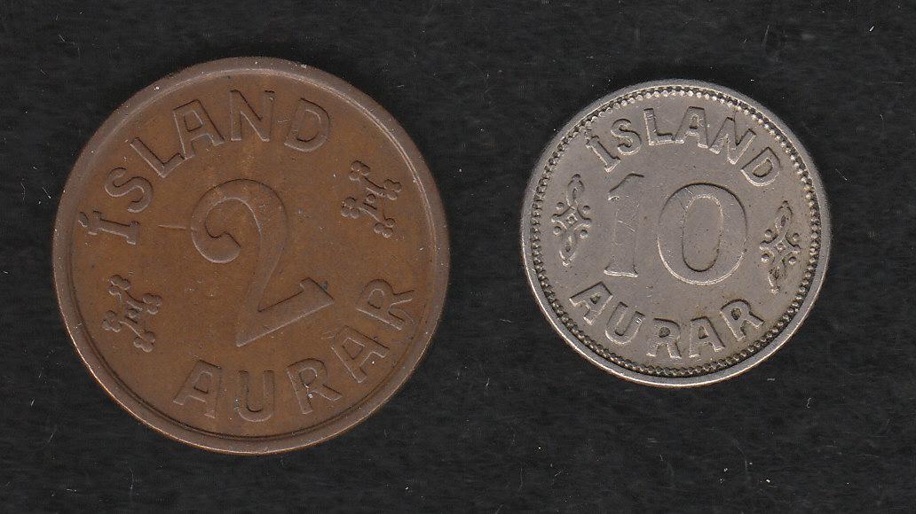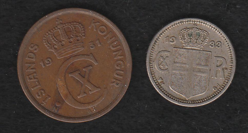 2 aurar, 1931, VF, bronze; Christian X; KM 6.1. 10 aurar, 1933, F, copper-nickel; Christian X; KM1.1.