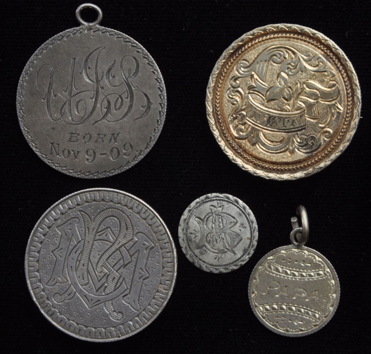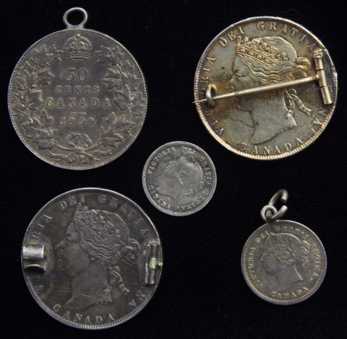 Love Tokens - 3 Canada 50 cent, one with loop at 12 p.m., one made into a broach, one partially made into pin, one 5 cent silver and one 10 cent with